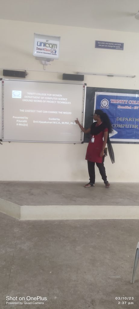 | 04 | 03.10.2023 | Computer Science | The chatbot that can change the world | Ms. P. Suruthi,II M.Sc., Comp. Sci.,Trinity College for Women, Namakkal |