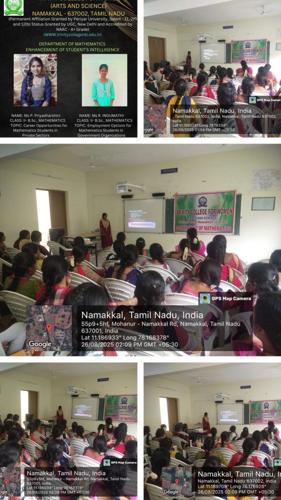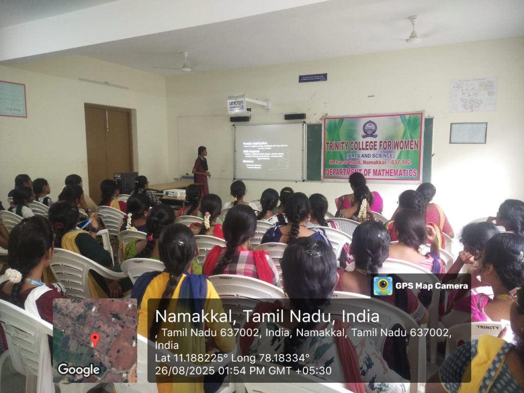 | 02 | 26.08.2025 | Mathematics | Employment Options for Mathematics Students in Government Organizations | Ms. R. Indumathi,Second Year B.Sc., Mathematics,Trinity College for Women, Namakkal |
