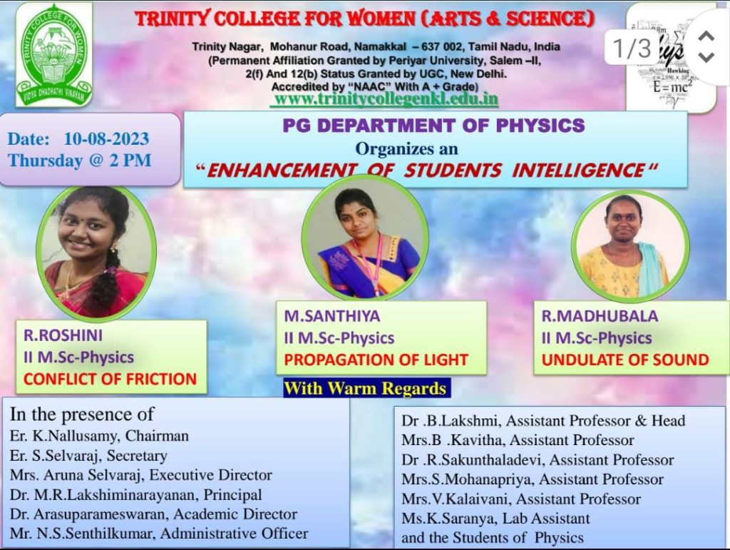 | 03 | 10.08.23 | Physics | Undulate of sound | Ms. R. MadhubalaII M.Sc., Physics, Trinity College for women, Namakkal |