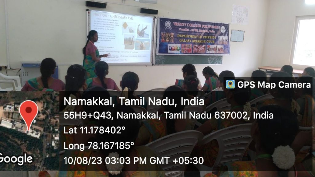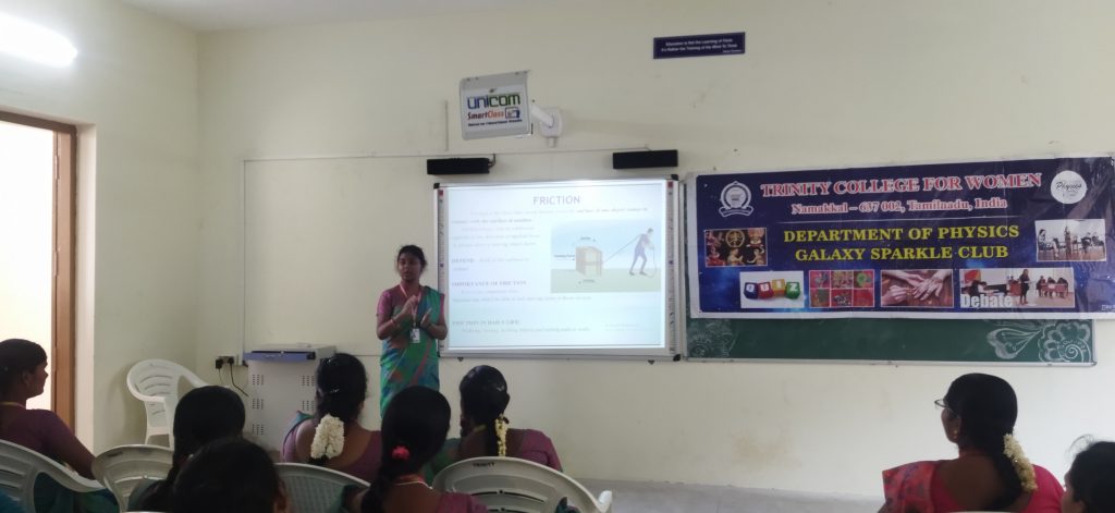 | 01 | 10.08.23 | Physics | Conflict of Friction | Ms. R. Roshini,II M.Sc., Physics, Trinity College for women, Namakkal |