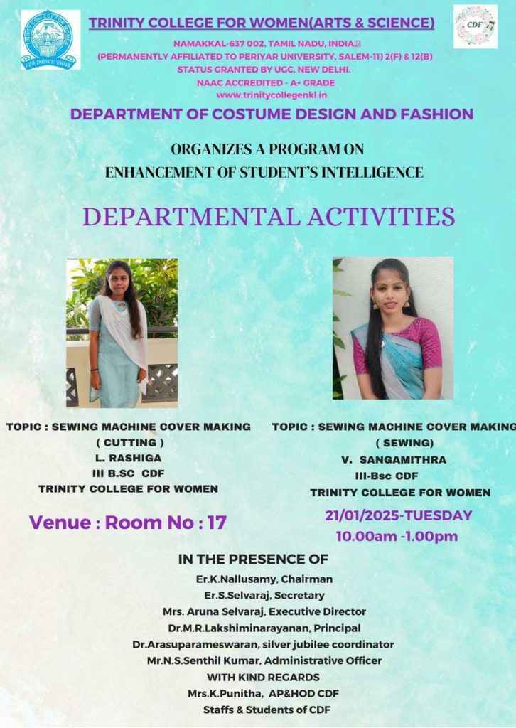 | 01 | 21.01.25 | Costume Design and Fashion | Sewing Machine Cover Making (Cutting) | Ms. L. Rashiga,III B.Sc., CDFTrinity College for Women, Namakkal |