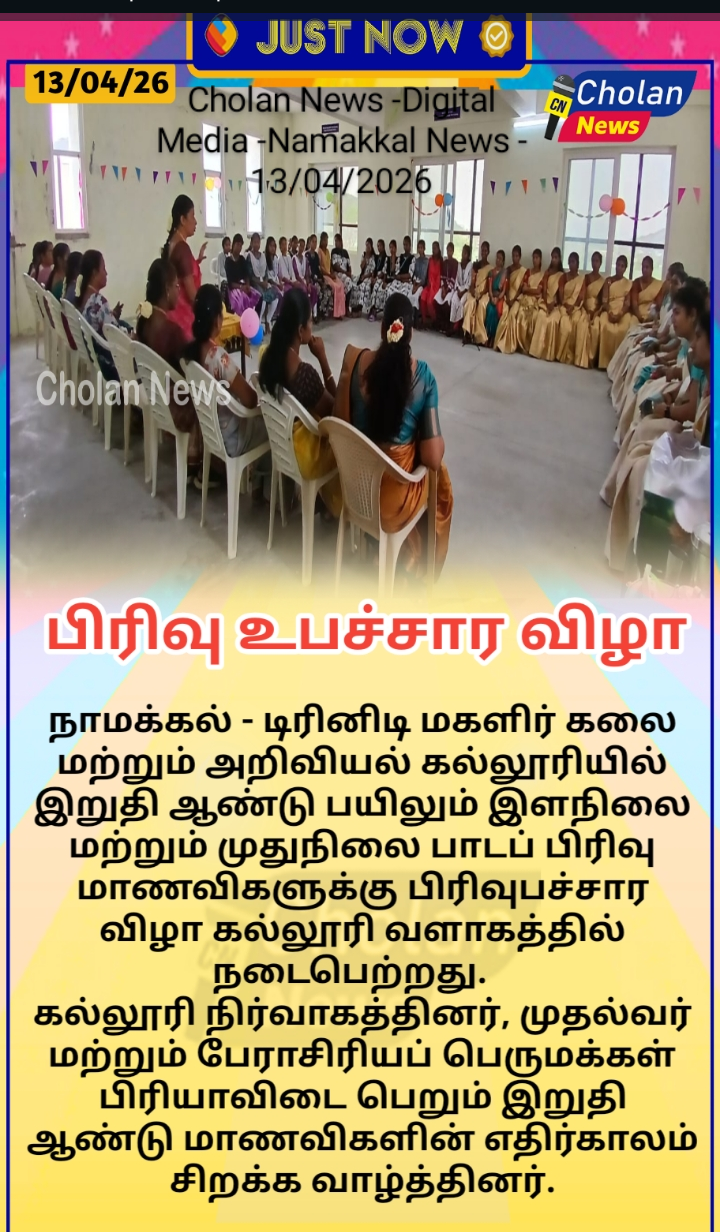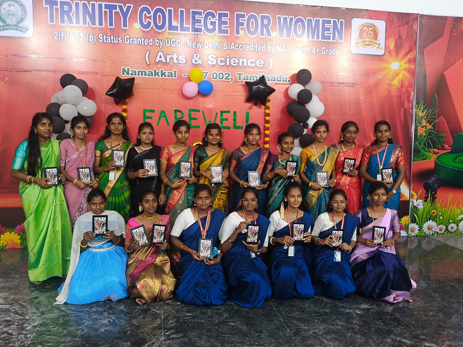 The farewell parties for the final-year students of the batch (UG 2023-2026 & PG 2024–2026) were held on April 10, 2026, and April 13, 2026, respectively, at the college premises. These programs were organized by the second-year and first-year undergraduate and postgraduate students of Trinity College for Women, Namakkal. All the faculty members of the college praised the final-year students and wished them a better future. Many final-year students shared their experiences while studying at this college. Er. K. Nallusamy, Chairman; Er. S. Selvaraj, Secretary; Mrs. Aruna Selvaraj, Executive Director; Dr. M.R. Lakshiminarayanan, Principal; Dr. R. Navamani, Vice-Principal; Mr. N.S. Senthilkumar, Administrative Officer; the various department heads; and faculty members conveyed their felicitations to all the final-year students.