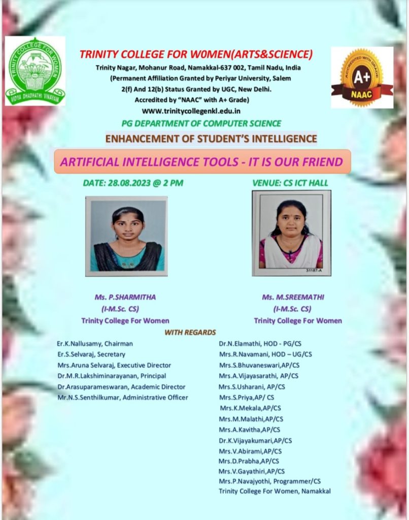 | 01 | 28.8.23 | Computer Science | Artificial Intelligence Tools – It is our friend | Ms. P. Sharmitha &Ms. M. SreemathiI M.Sc., Computer Science, Trinity College for Women, Namakkal |