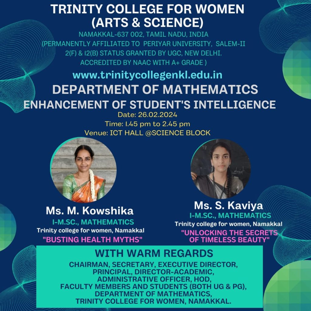 | 01 | 26.02.2024 | Mathematics | Busting Healths Myths | Ms. M. Kowshika,First M.Sc., MathematicsTrinity College for Women, Namakkal |