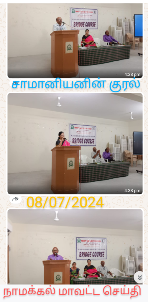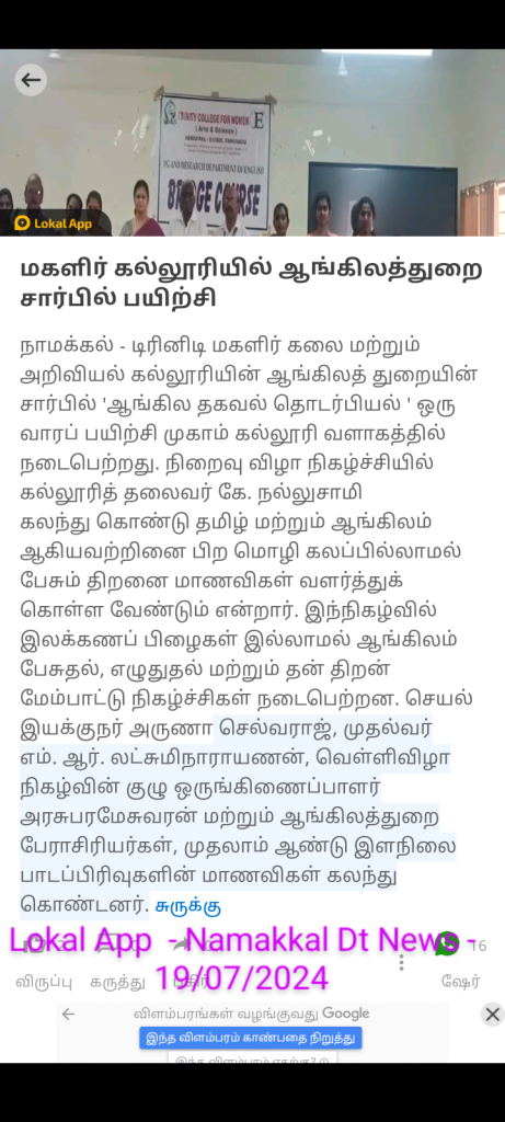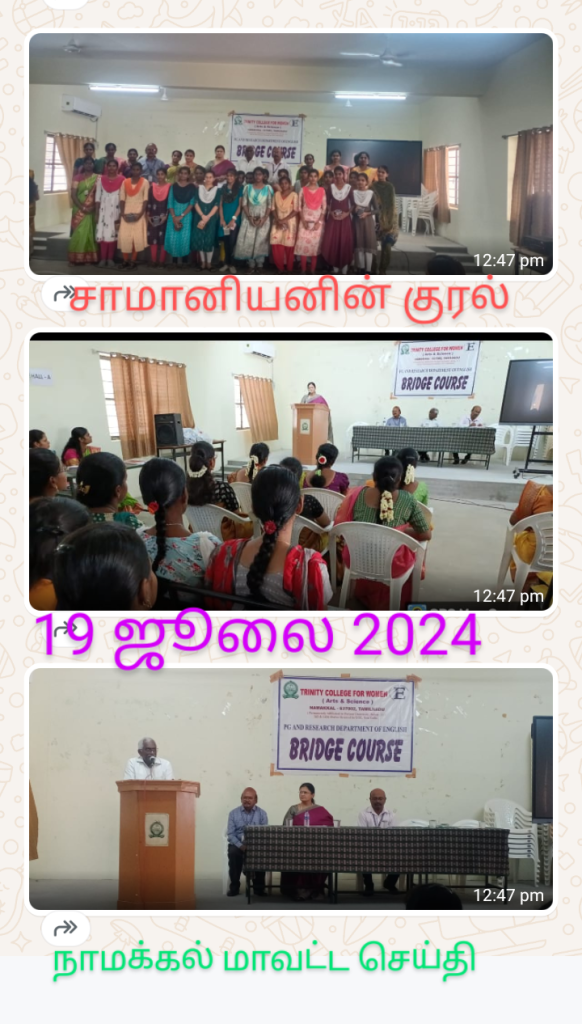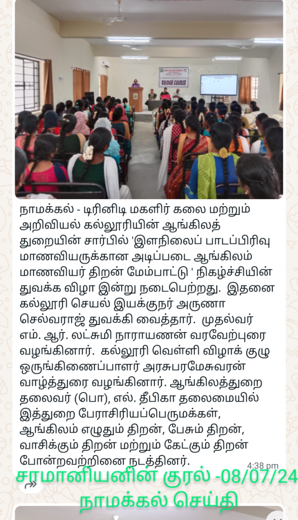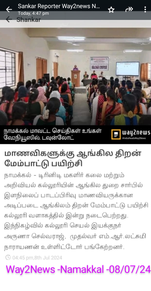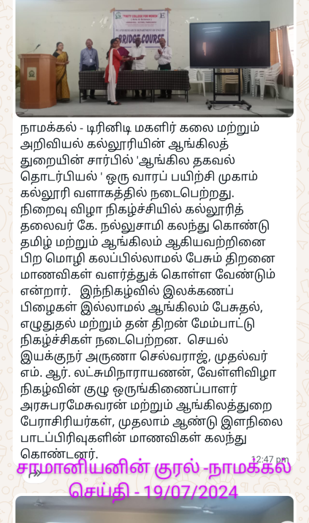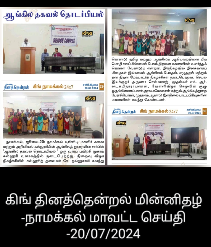 For the academic year 2024-2025, the department of English, Trinity College for Women (Arts and Science), Namakkal conducted a one-week English Bridge Course from 05th July 2024 to 12th July 2024.