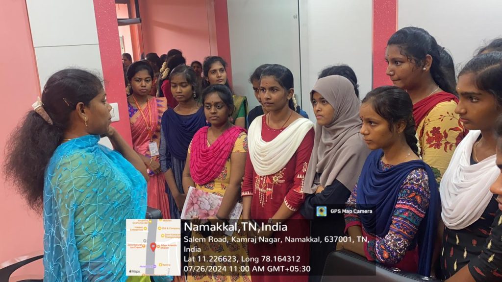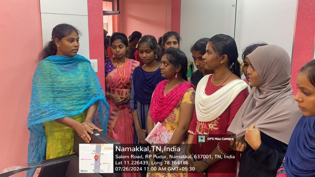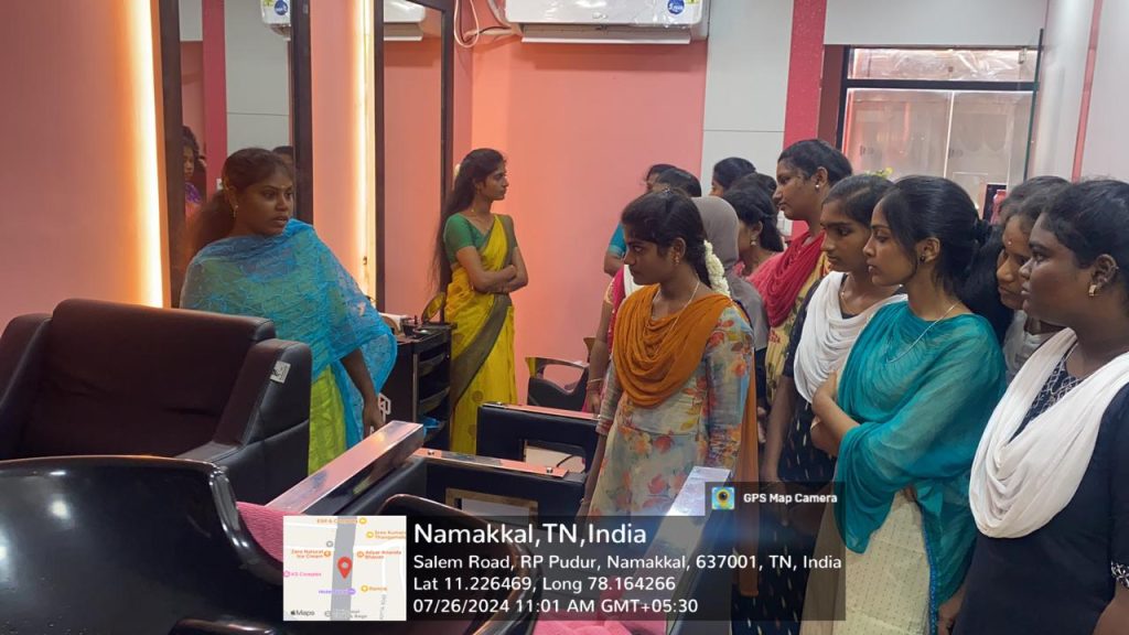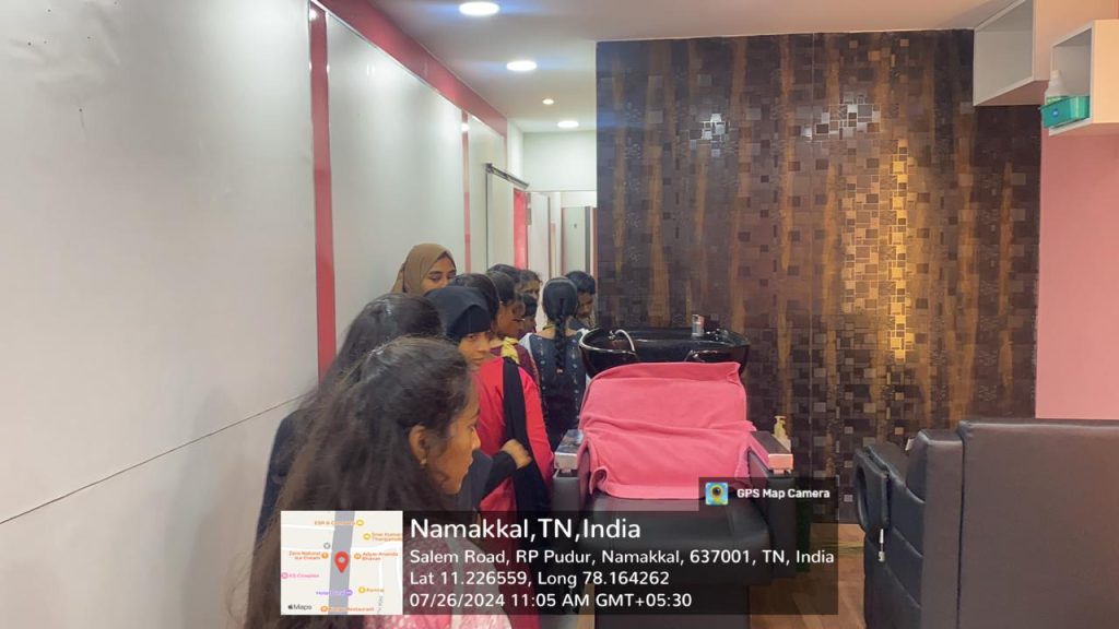 Four faculty members (Mrs. K. Punitha, Ms. K.P. Theepika, Mrs. A.P. Pavithra, and Ms. R. Saranyadevi) along with the 36 students of Costume Design & Fashion, Trinity College for Women, Namakkal, visited the Natural Glam Beauty Salon/Parlor, Salem Road, Namakkal, on July 26, 2024.