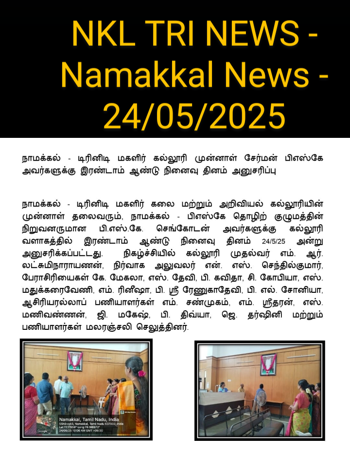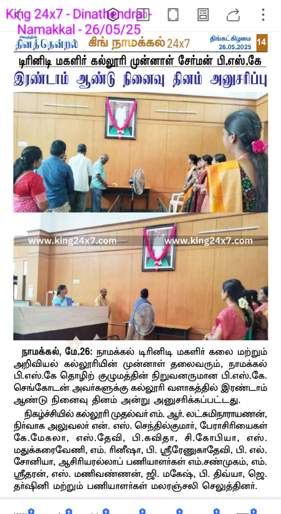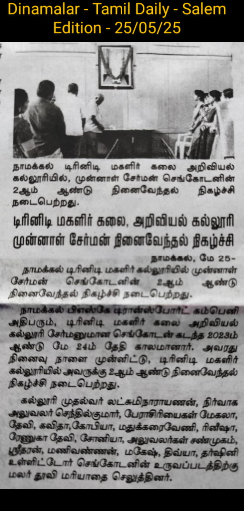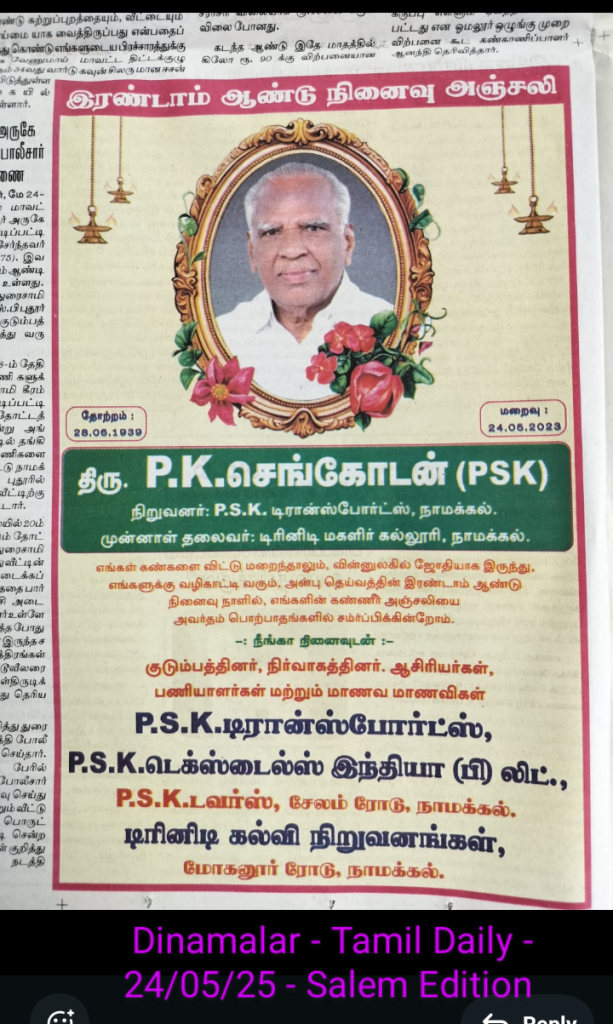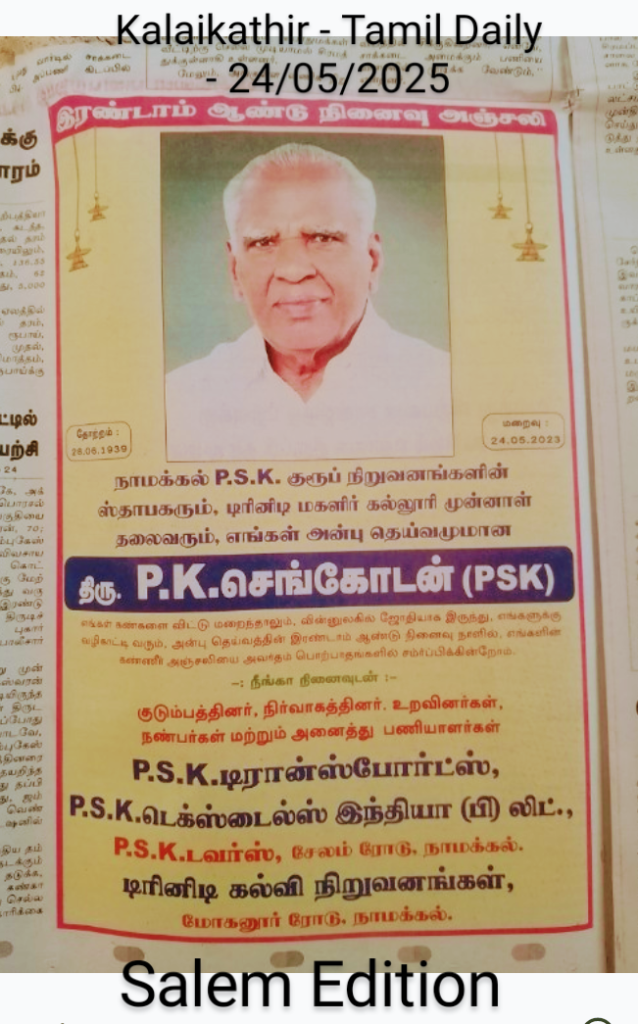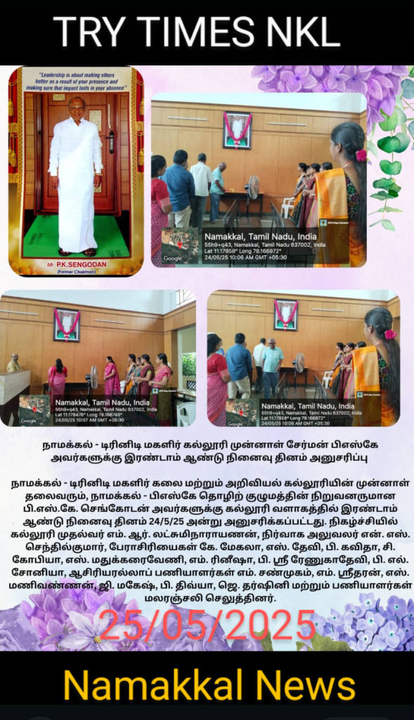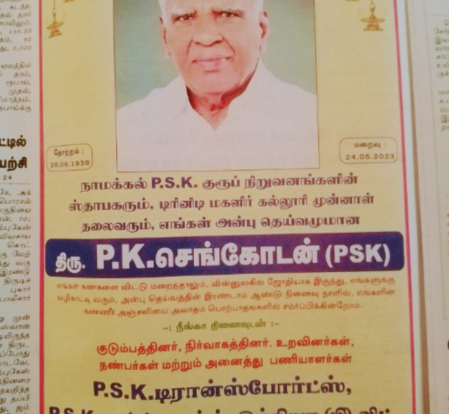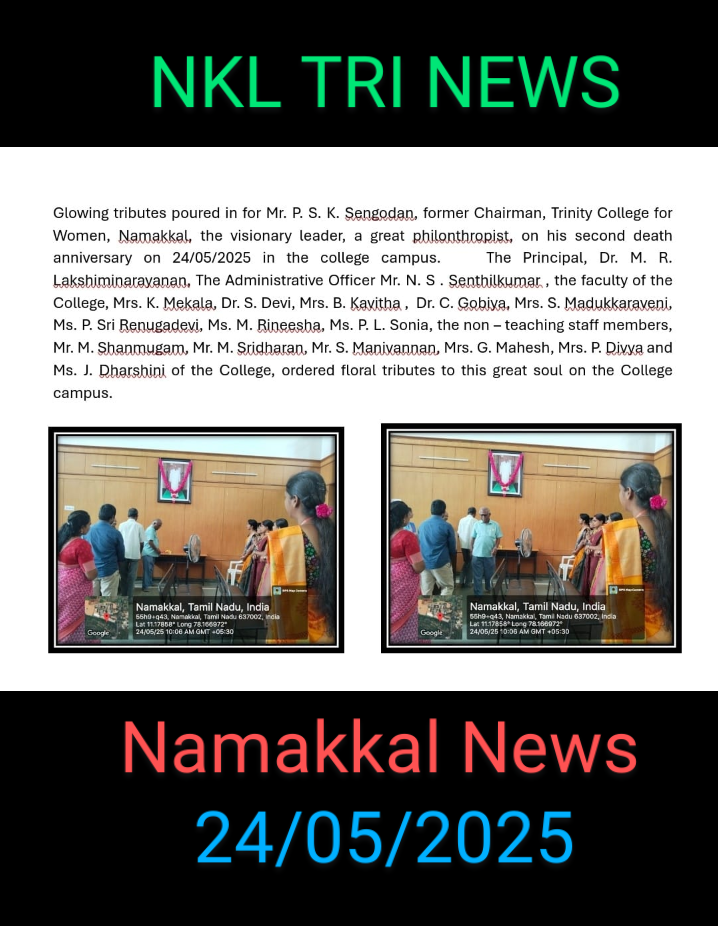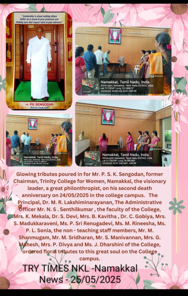 Glowing tributes poured in for Thiru. P. S. K. Sengodan, former Chairman of Trinity College for Women, Namakkal, the visionary leader, a great philanthropist, on his 02nd death anniversary on 24th May 2025.