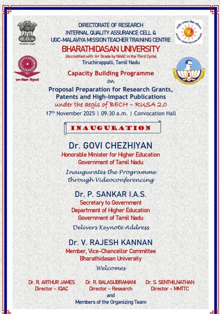 The Directorate of Research Internal Quality Assurance Cell and the University Grants Commission – Malaviya Mission Teacher Training Centre, Bharathidasan University, Trichirappalli, Tamil Nadu state, conducted a one-day capacity building programme titled “Proposal preparation for Research Grants, Patents and High-Impact publication” (Under the aegis of Bharathidasan University Entrepreneurship and Career Hub (BECH), Rashtriya Uchchatar Shiksha Abhiyan (RUSA) – 2020 on 07th November 2025.   It was held through the mode of virtual stream.    In this regard, The Internal Quality Assurance Cell, Periyar University, Periyar Palkalai Nagar, Salem arranged a live online programme in the senate hall of the University on that day.