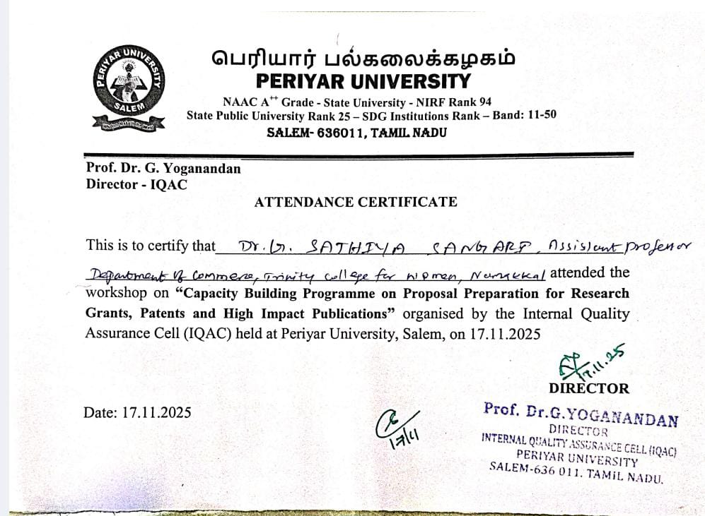 On behalf of Trinity College for Women, Namakkal, Dr. G. Sathiya Sangari, Assistant Professor of Commerce & Coadjutor of IQAC participated in that programme.