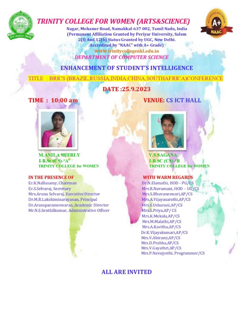 | 01 | 25.09.2023 | Computer Science | BRICS – Brazil, Russia, India, China and South Africa | Ms. M.Anila SherlyI B.Sc., CS “A” &Ms. V.S. Sagana,I B.Sc., CS “B”Trinity College for Women, Namakkal |