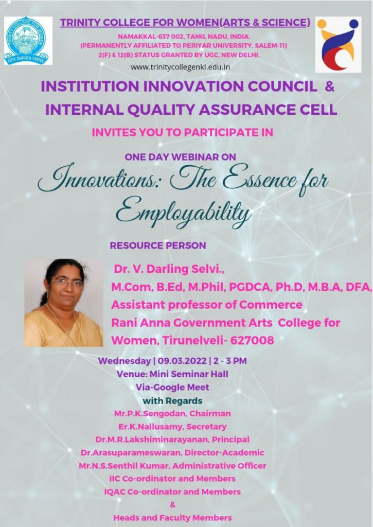 The Institution’s Innovation Council of Trinity College for Women, Namakkal organized a one day webinar event in the title of “Innovations: The Essence for Employability” on 9th March 2022.