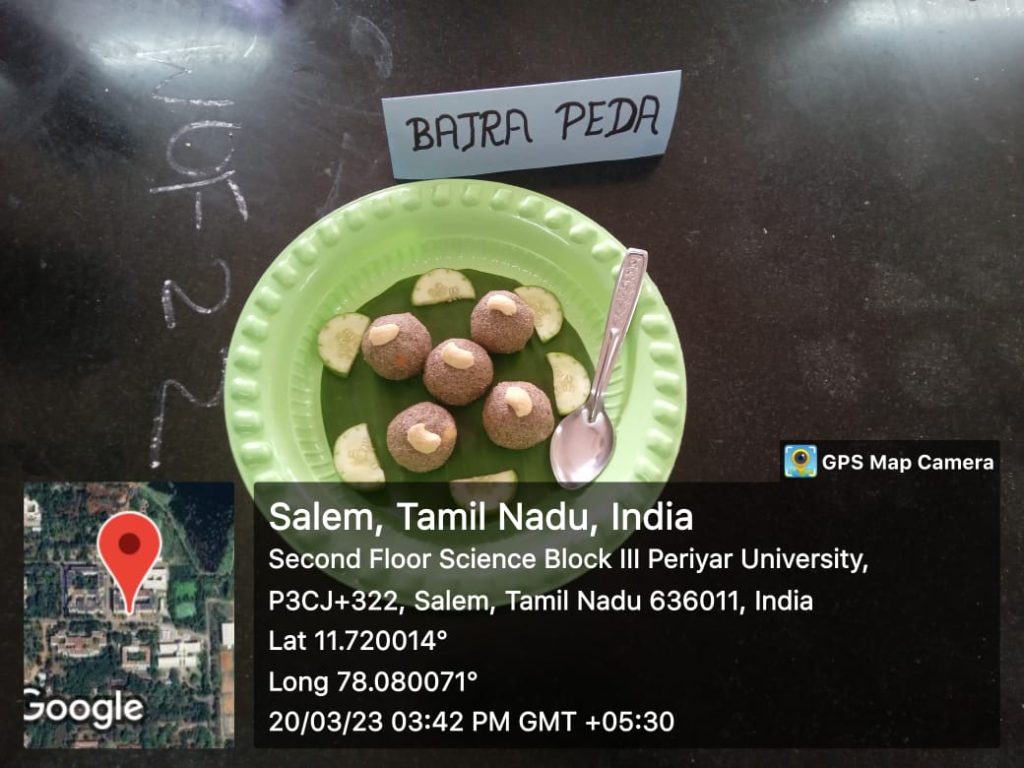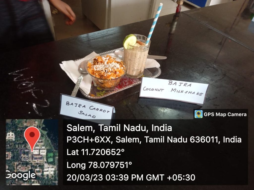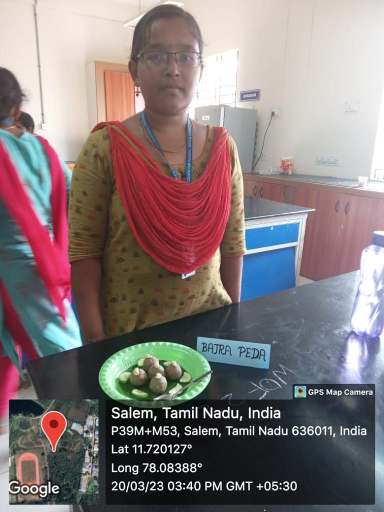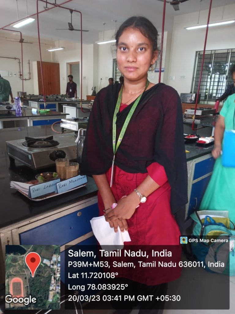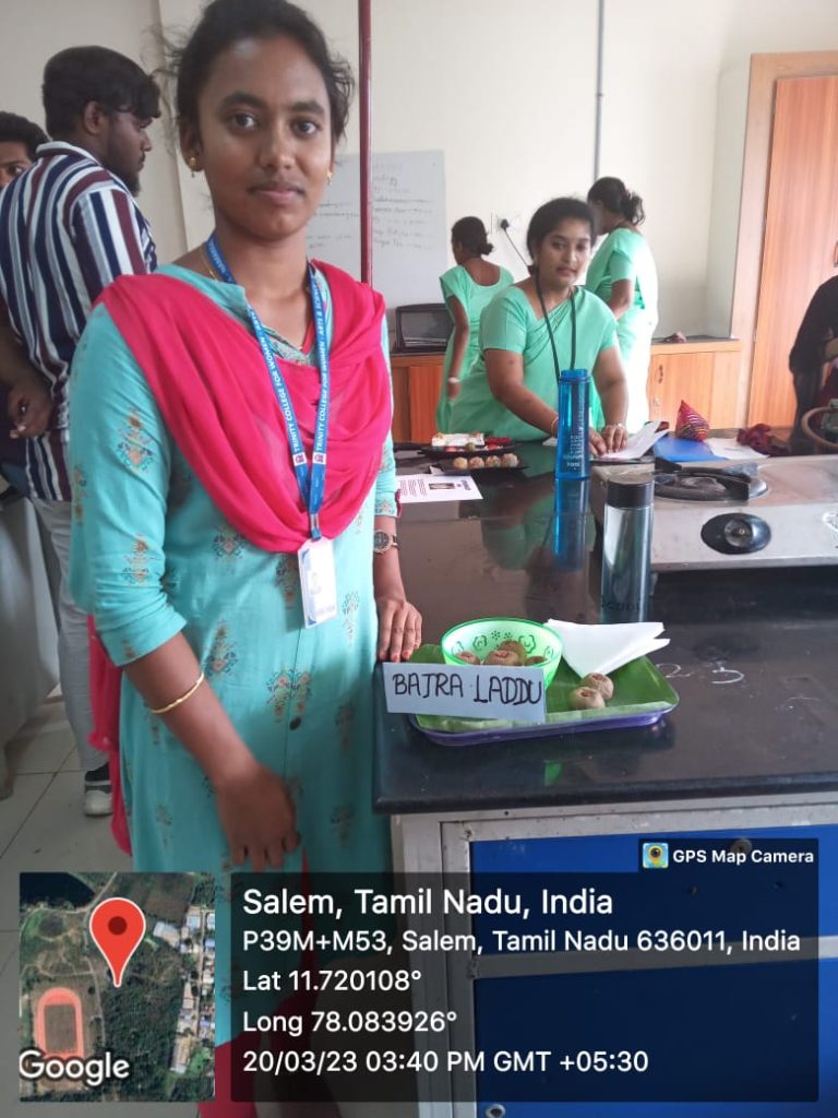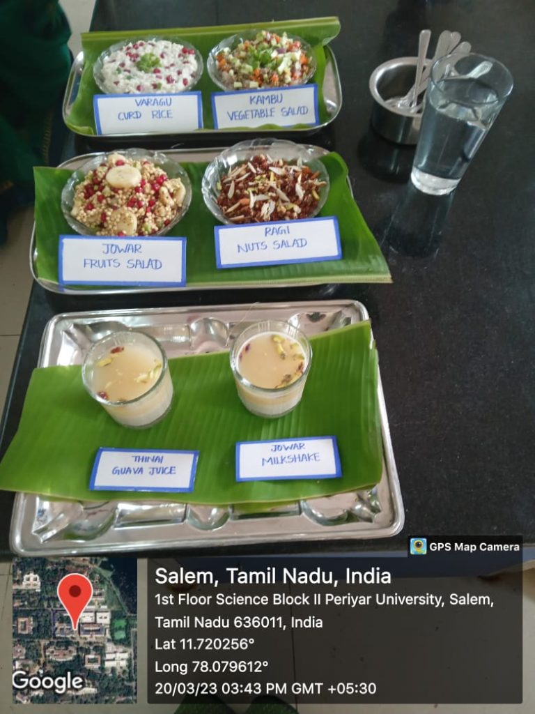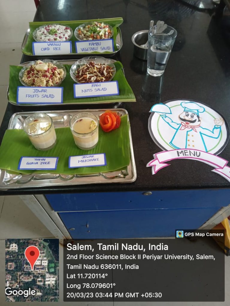 In a consequence of the international year of Millet, the department of Food Science and Nutrition, Periyar University, Salem organized a one day millet based cookathon on 20th March 2023 in the College food and production lab. Dr. T. Poongodi Vijayakumar, Professor and Head, Department of Food Science and Nutrition, the faculty of this department Dr. J. Prakash Maran, Dr. R. Parimaladevi, Dr. S. Thilagavathi, Dr. K. Karthikeyan, Dr. P. Karthika, Dr. M. Deepa and Mrs. Jothimangalam, Faculty, B.Voc Professor, Department of Food Science and Nutrition, Periyar University organized this cookathon. More than 100 students in various Colleges of Tamil nadu state took part in that programme. 4 students of Nutrition and Dietetics took part in that event. Our second year B.Sc., Nutrition & Dietetics students Ms. K. Sanajana got second place in the fireless cooking.