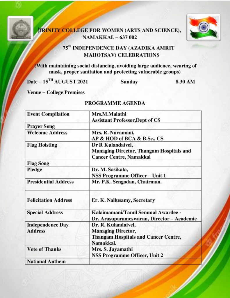 | 15.08.20218.45 AM | 75th Independence Day Celebrations | (Azadika Amrit Mahotsav) | Dr. R. Kulandaivel & Dr. Deepti Mishra Thangam Hospitals and Cancer Centre, Namakkal – 637 001 Were the chief guests | Trinity College for Women, Namakkal celebrated the 75th year independence day celebrations (AZADI KA AMRIT MAHOTSAV). Mr. P.K. Sengodan, Chairman of the college hoisted the tricolor flag at the premises of College. Dr. R. Kulandaivel, MD, Thangam Hospitals and Cancer Centre highlighted the sacrifice of our Indian freedom fighters. Dr. Deepti Mishra, Special Invitee, Thangam Hospitals and Cancer Centre, Namakkal, in her address, congratulated the college for celebrating Independence day despite the pandemic. She also said that today’s youth is tomorrow’s future in the making of new India. We need a good Indian citizen. Each and every staff should encourage your student’s community for our nation’s development in all aspects, she denoted. |