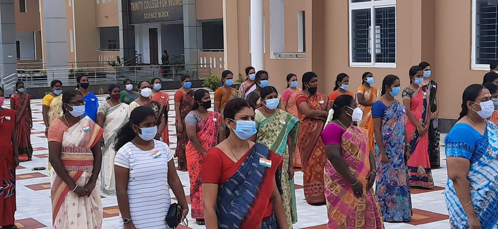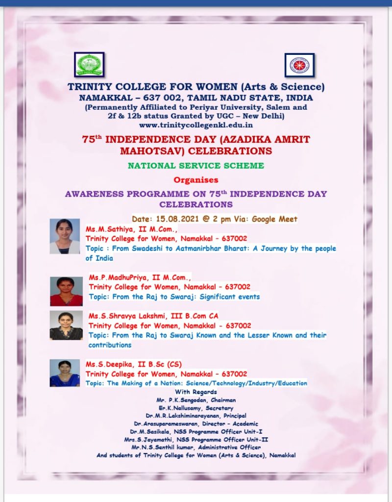 On account of 75th Independence Day (AZADIKA AMRIT MAHOTSAV) celebrations, The National Service Scheme of Trinity College for Women, Namakkal executed an online awareness event on 15th August 2021 @ 11 AM. It was held on the platform of Google Meet.