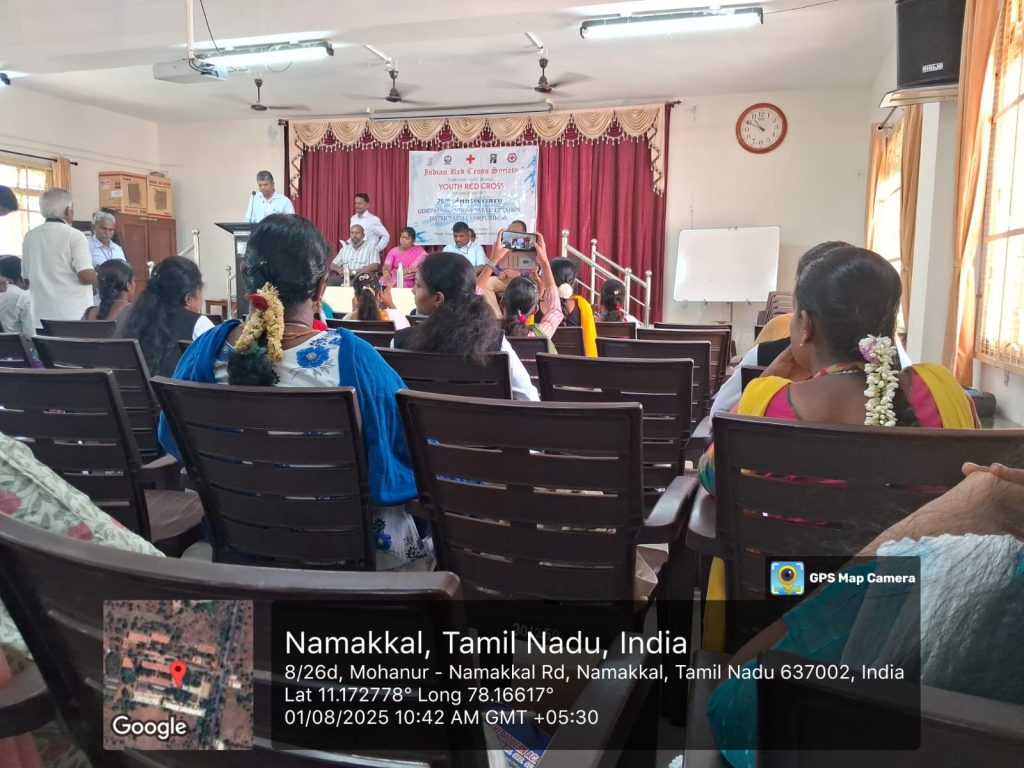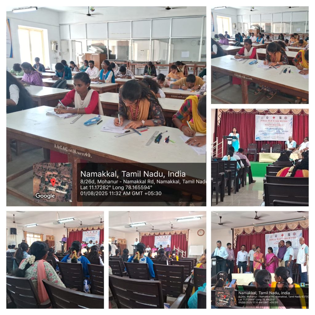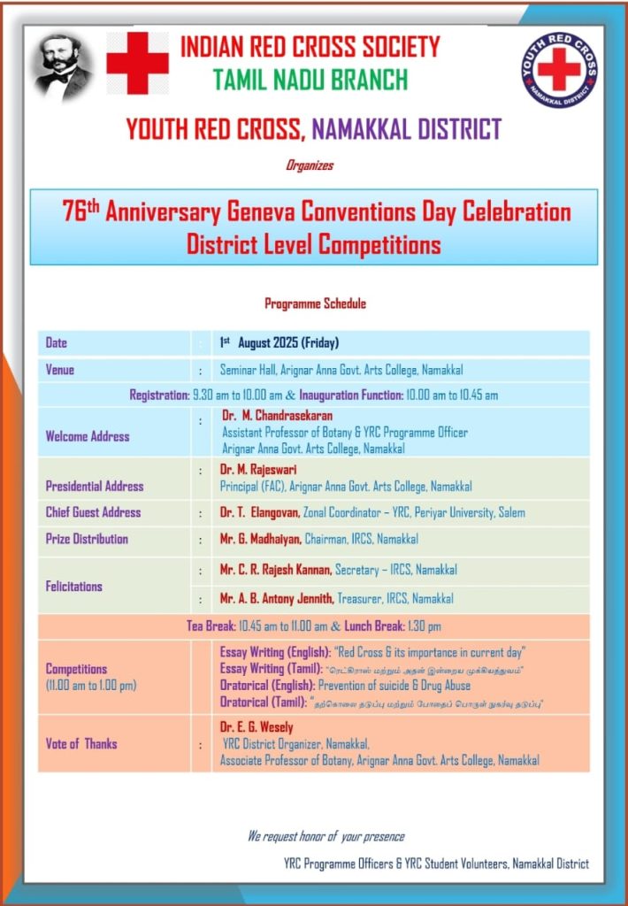 Indian Red Cross Society, Tamil Nadu Branch, in association with the Youth Red Cross, Namakkal District organized a one day 76th Anniversary Geneva Day Competitions on 01st August 2025 in the premises of Arignar Anna Government Arts College, Namakkal.
