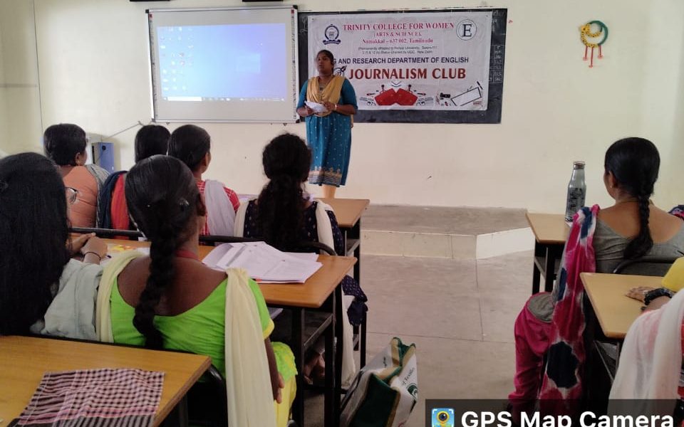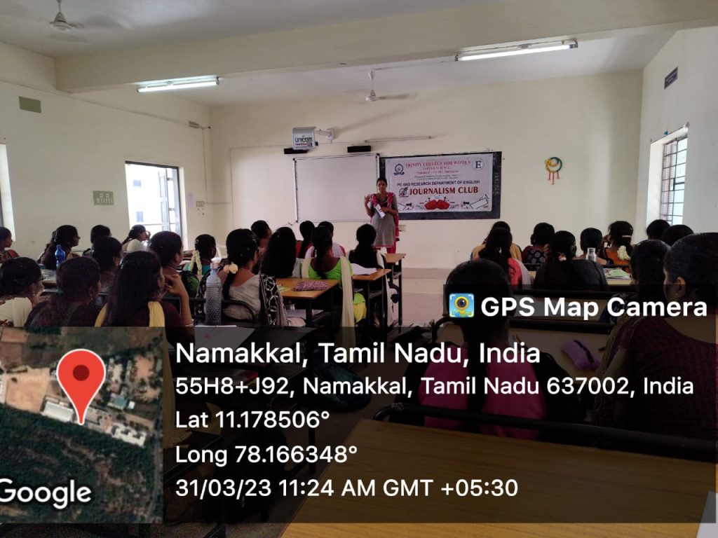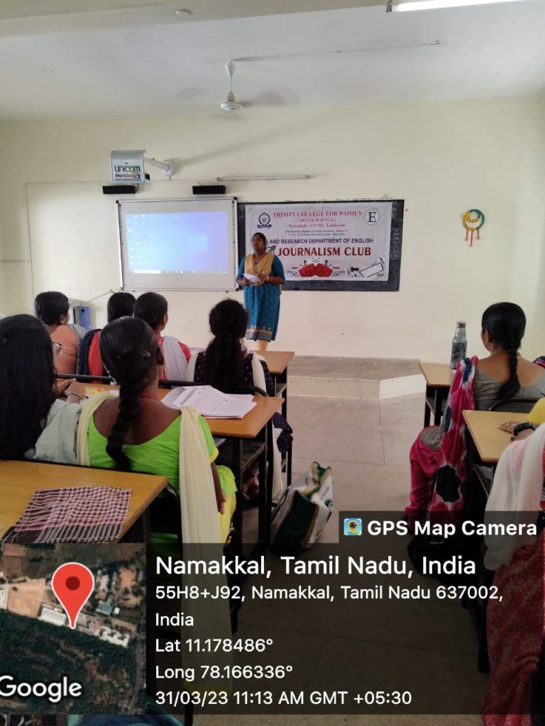 Journalism Club – Department of English, Trinity College for Women, Namakkal conducted a programme entitled “Steps and tips to become a young journalist” on 31.03.2023. It was held in the ICT hall of the department of English. Mrs. G. Kannagi and Mrs. J. Evangelin, Faculty of English, Trinity College for Women were the contrivers. Ms. N. Nalinikumari and Ms. N.K. Dhanushri, II M.A., English of the College spoke, and they elaborated the various employment opportunities in journalism sectors like reporter, correspondent, photojournalist, editorial cartoonist, proofreader, website designer, editorial writer, Human Resource Manager and so on. More than 150 English students took part.