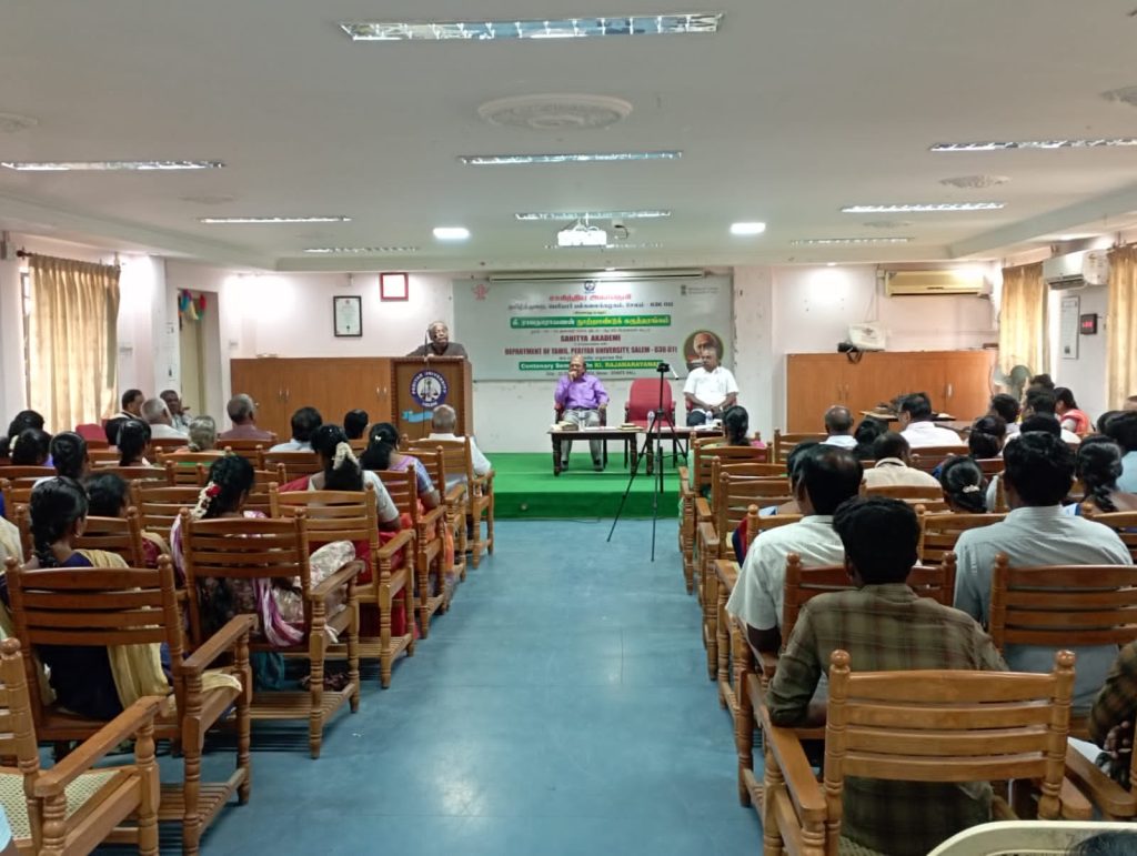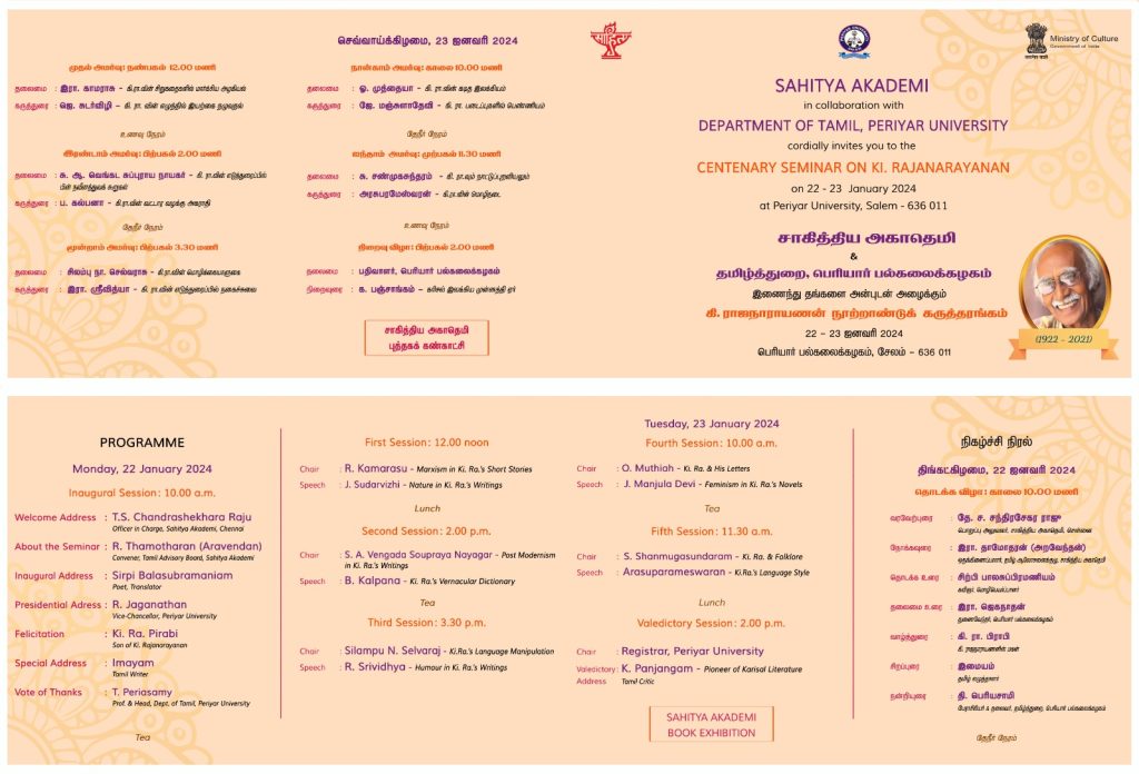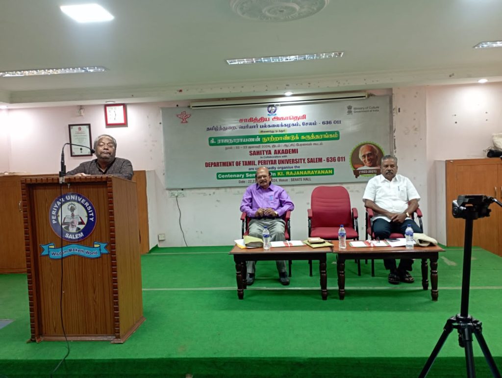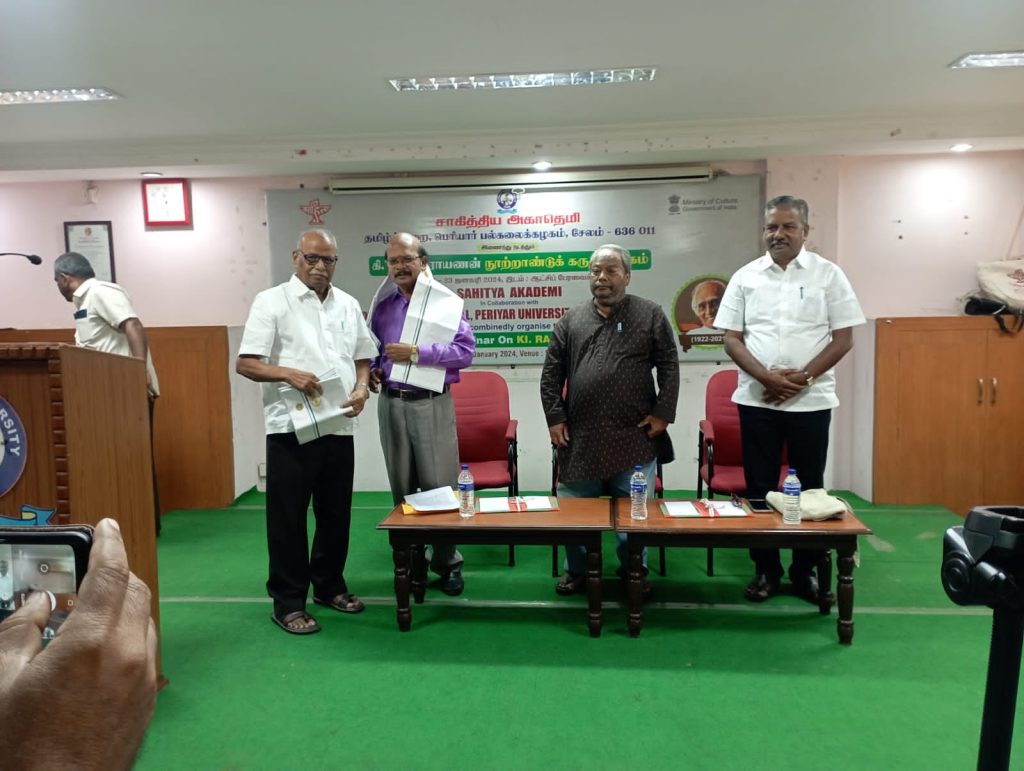M/s. Sahitya Akademi, in collaboration with the department of Tamil at Periyar University, Periyar Palkalai Nagar, Salem, conducted a two-day centenary seminar entitled “Ki. Rajanarayanan” (கி. ராஜநாராயணன் நூற்றாண்டு விழா கருத்தரங்கம்) on 22nd and 23rd January 2024 on the campus of the university.