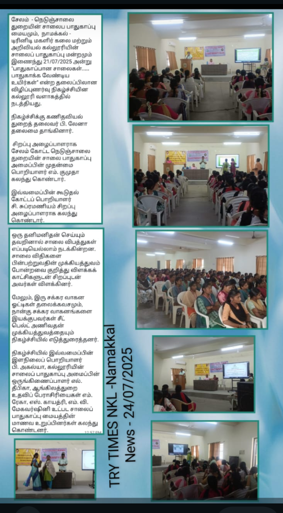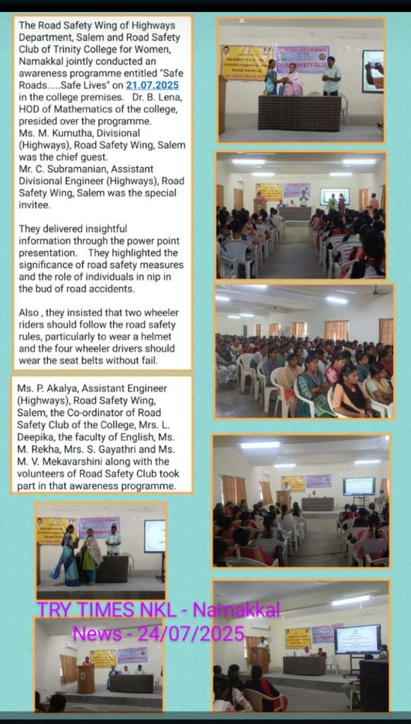 M/s. Highway Department Road Safety Wing, Salem & M/s.  Road Safety Club, Trinity College for Women, Namakkal jointly conducted an awareness programme on “Safe Roads ….. Safe Lives” on 21.07.2025 in the college campus.