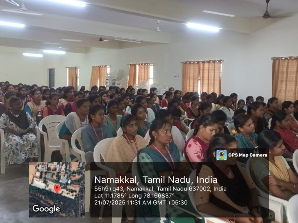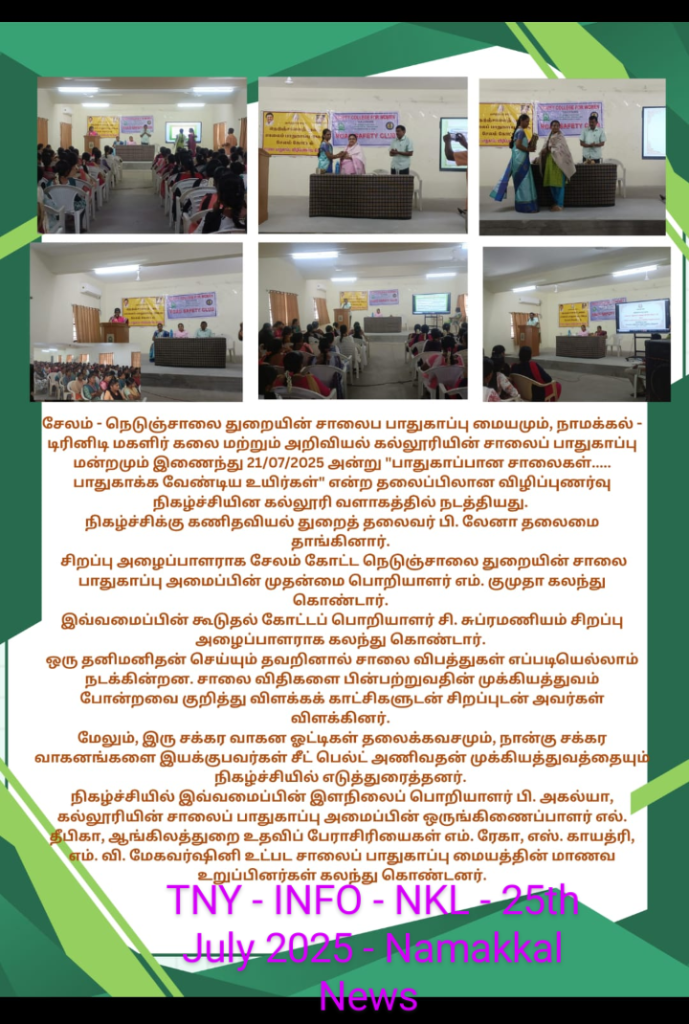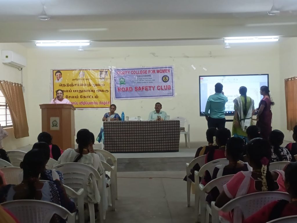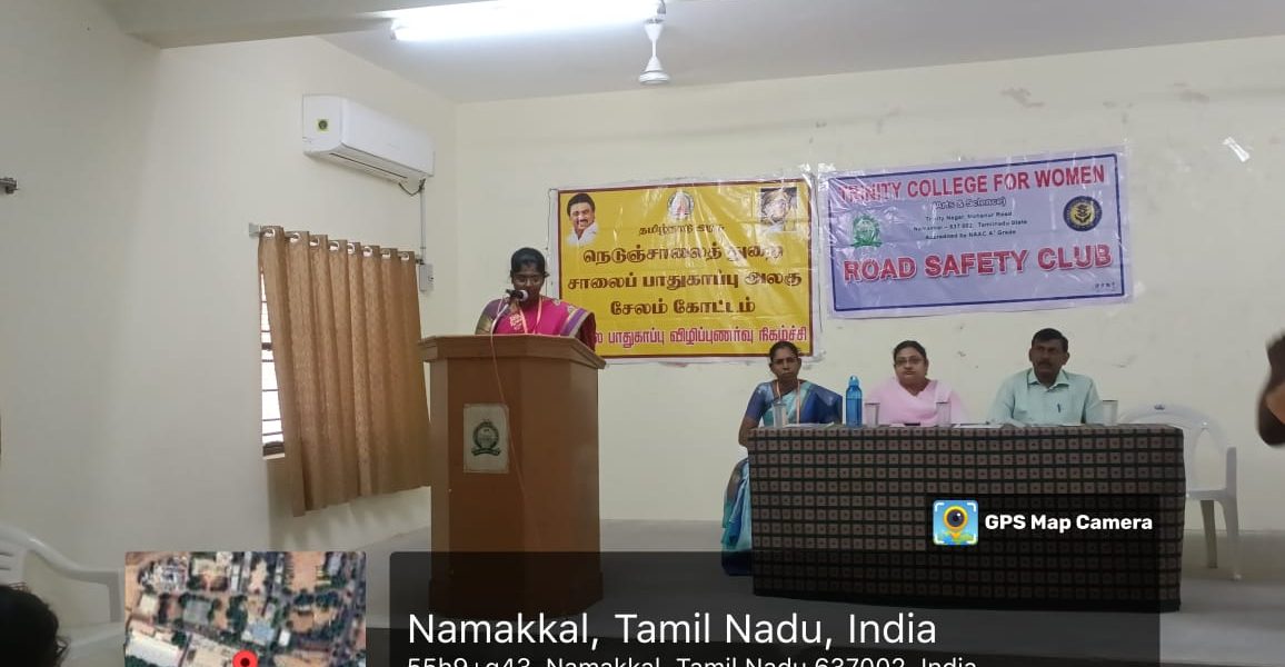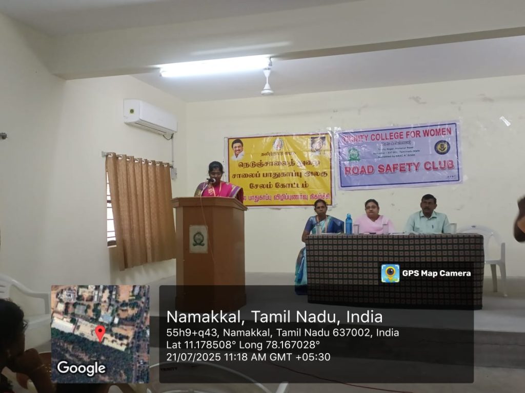 M/s. Highway Department Road Safety Wing, Salem & M/s. Road Safety Club, Trinity College for Women, Namakkal jointly conducted an awareness programme on “Safe Roads ….. Safe Lives” on 21.07.2025 in the college campus.