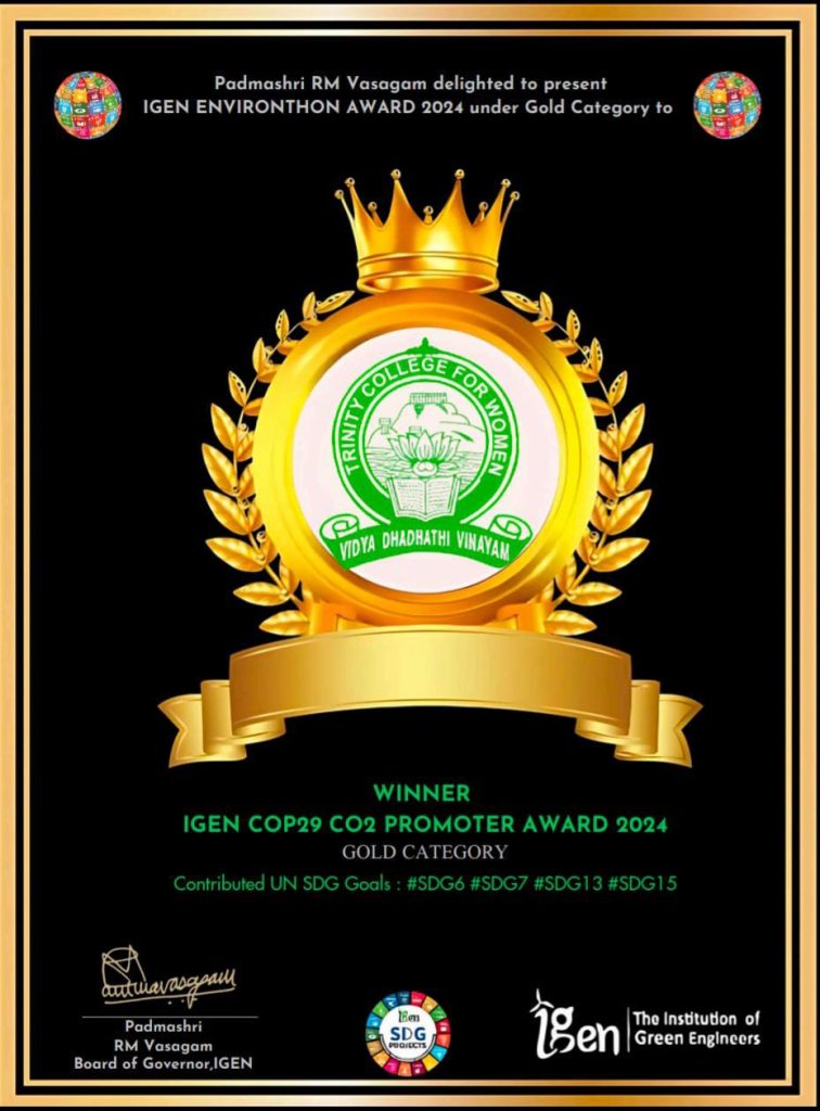M/s. Padmashri RM Vasagam IGEN Environthon Award – 2024 was presented to Trinity College for Women, Namakkal under the Gold category – (Winner – IGEN COP29 C02 Promoter Award 2024 – The Institution of Green Engineers).