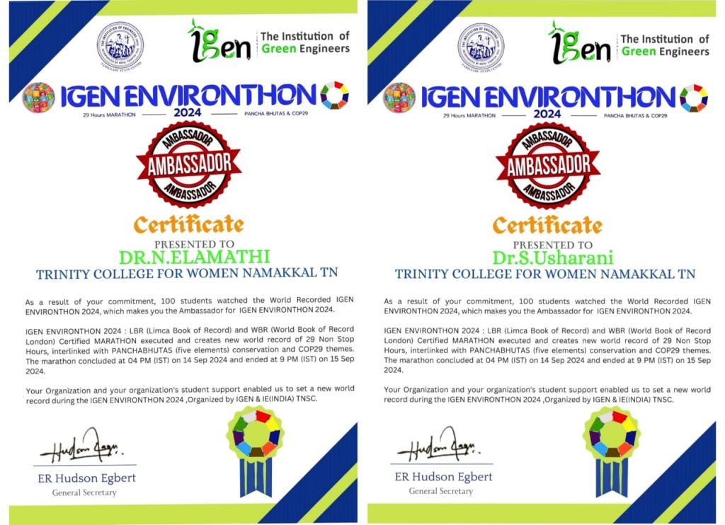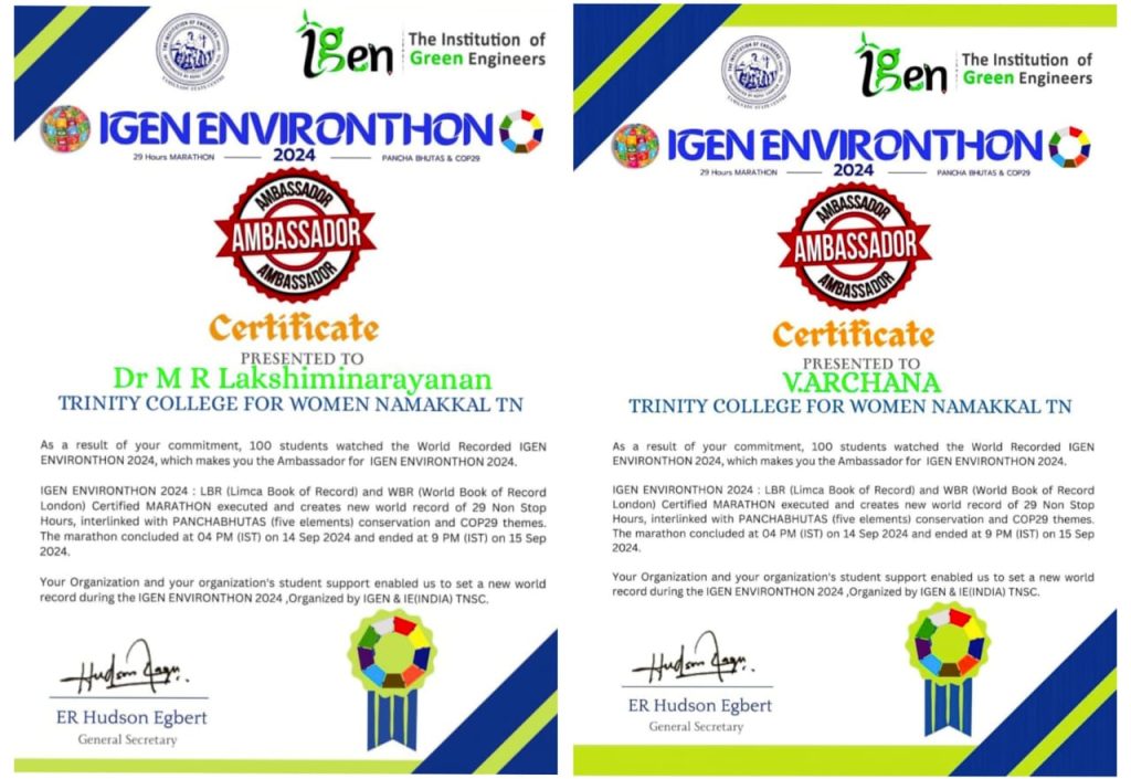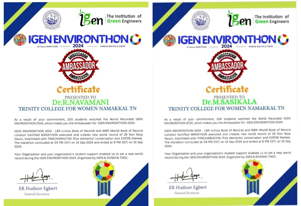 Apart from that IGEN (The Institution of Green Engineers) Environthon – 2024, Ambassador Certificates were received by the following faculty members of Trinity College for Women, Namakkal from ER HudsonEgbert, General Secretary of IGEN, Environthon.