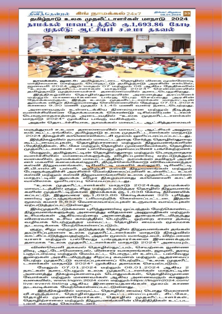 M/s. Tamil Nadu Skill Development Corporation, Chennai, conducted a two-day event entitled “Tamil Nadu Global Investors Meet (TNGIM-2024)” on January 7 and 8, 2024, in the premises of the Trade Centre, Nandambakkam, Chennai.