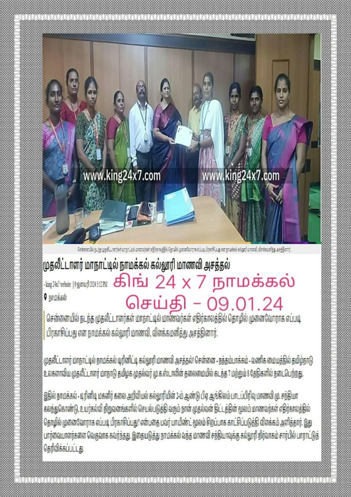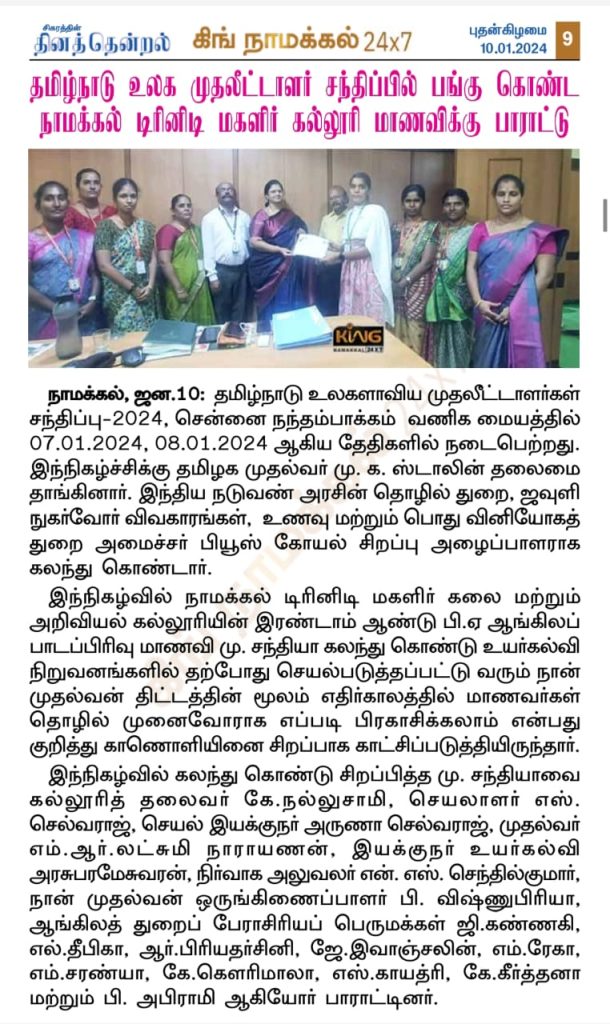 On behalf of Trinity College for Women, Namakkal, Ms. M. Sandhiya, a second-year B.A. English, took part, and she presented a video (with PPT) for the importance of entrepreneurship in the current scenario. Also, she pointed out in that video how Naan Mudhalvan programs (the additional curriculum in Arts & Science Colleges and Engineering Colleges in Tamil Nadu state) will be helpful for creating entrepreneurship.