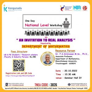 The Department of Mathematics, Kongunadu College of Engineering and Technology, Tholurpatti, Thottiyam Taluk, Tiruchirappalli District organized a one day national level workshop entitled “An invitation to Real Analysis” on 20.10.2022 @ JV Hall.