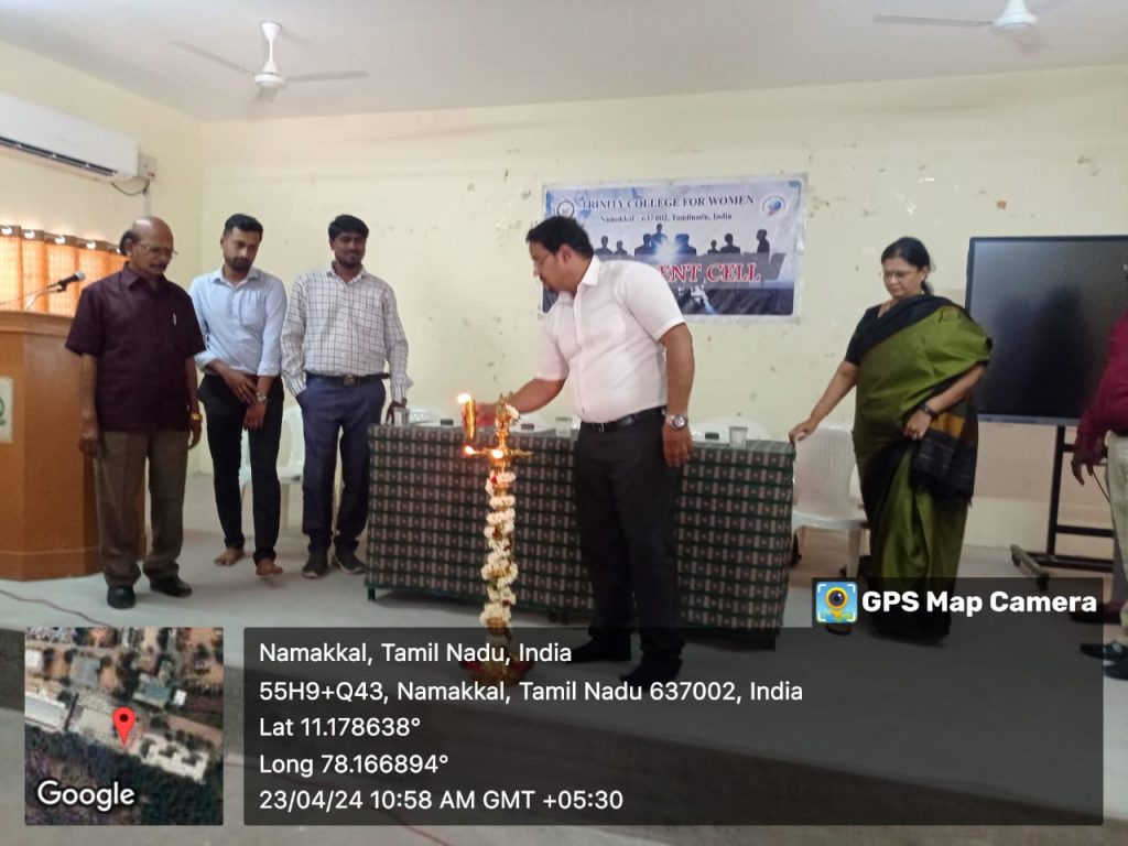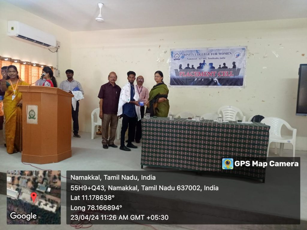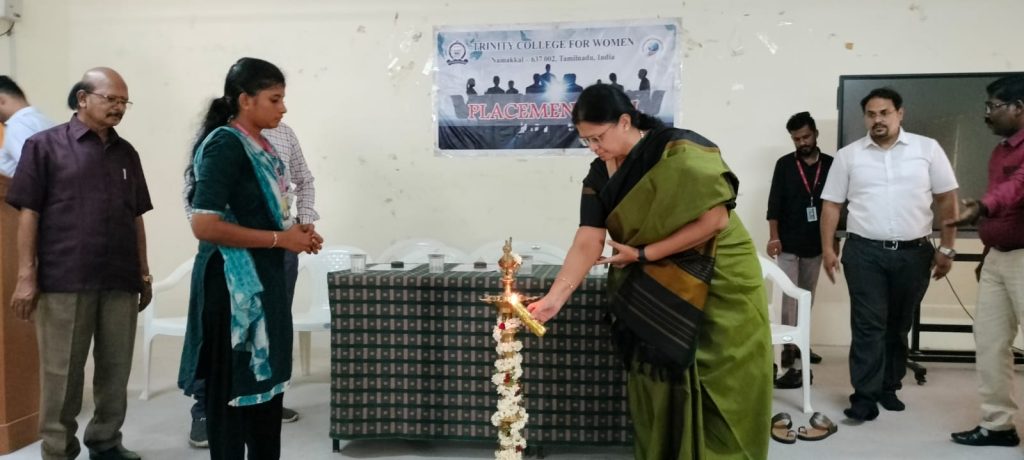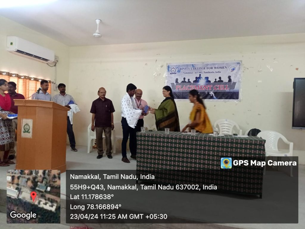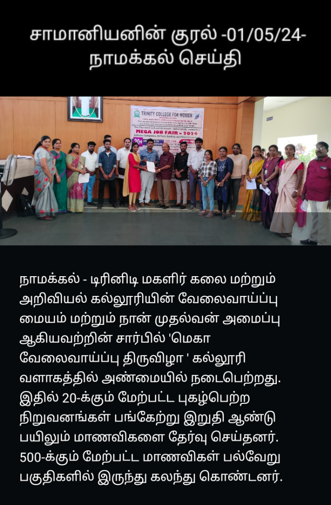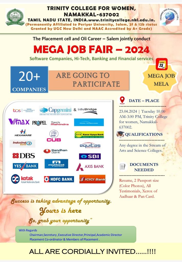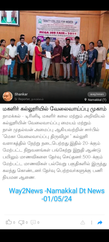 The Placement Cell, in association with Naan Mudhalvan of Trinity College for Women, Namakkal, and Oli Career, Salem, jointly organized a one-day ‘Mega JobFair 2024” on April 23, 2024, on the college campus. More than 20 reputed organizations in and around various parts of India took part. More or less 500 current final-year students (both undergraduate and postgraduate) as well as outgoing students of Trinity College for Women, Namakkal, attended that interview.