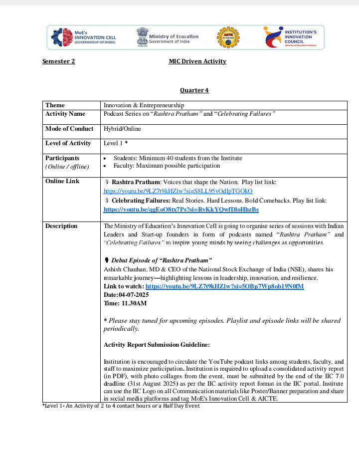 The Ministry of Education’s Innovation Cell has initiated a national-level podcast series titled “Rashtra Pratham” and “Celebrating Failures” focused on inspiring young minds by showcasing the stories of India’s most efficacious leaders and founders of establishment of new industries.       This initiative is designed to assist students in viewing opportunities and challenges, to support a mindset of innovation and leadership.