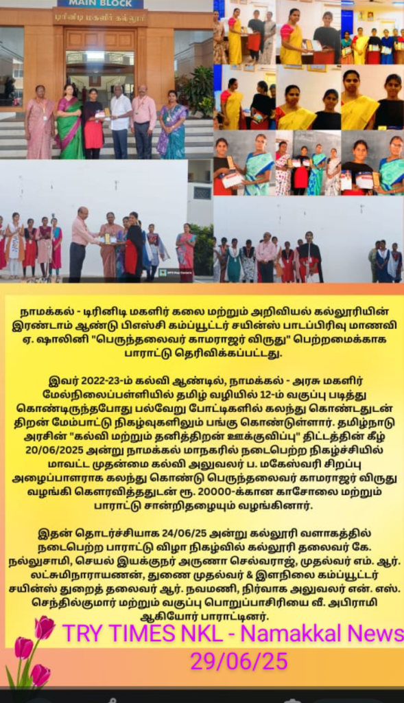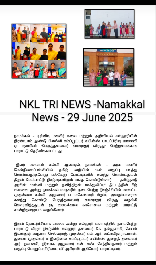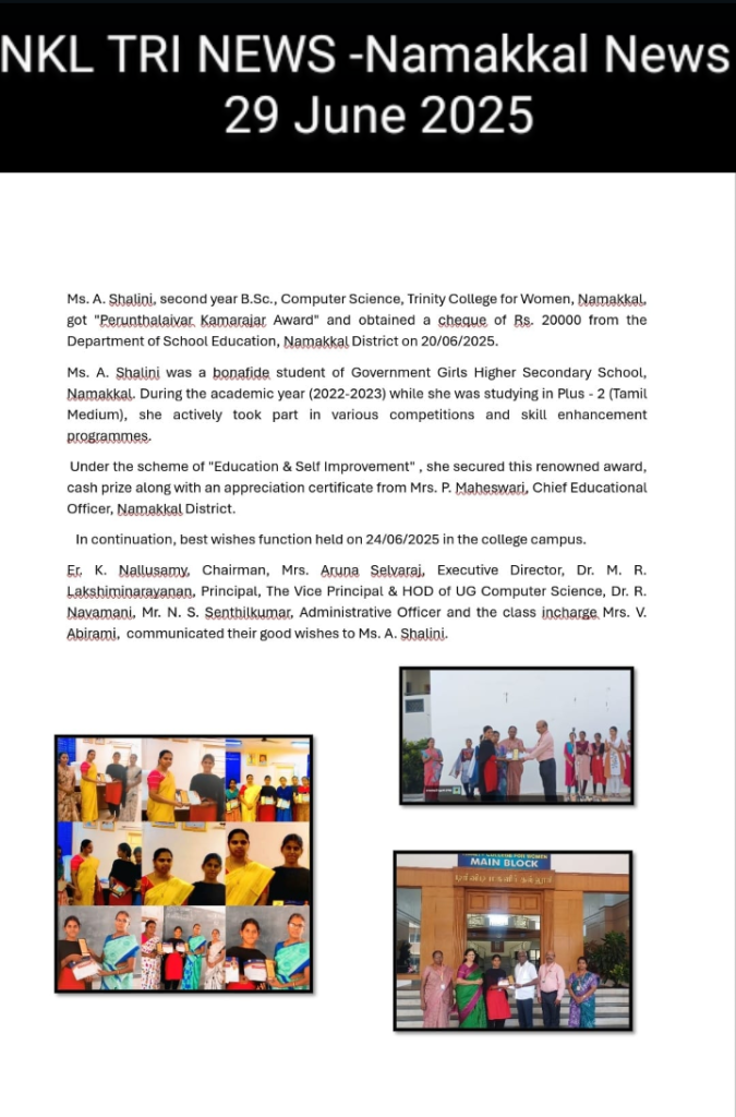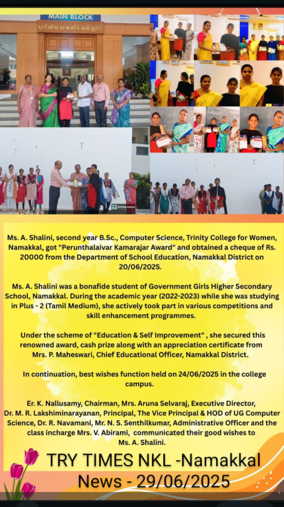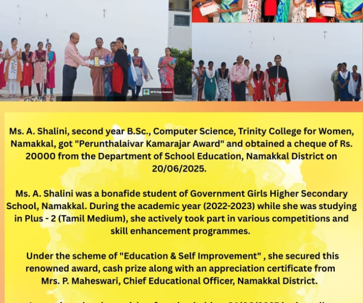 Ms. A. Shalini, second year B.Sc., Computer Science, Trinity College for Women, Namakkal, got a “Perunthalaivar Kamarajar Award” and obtained a Rs. 20000/- (Rupees twenty thousand only) value of cheque along with Appreciation Certificate from the Department of School Education, Namakkal District on 20th June 2025.