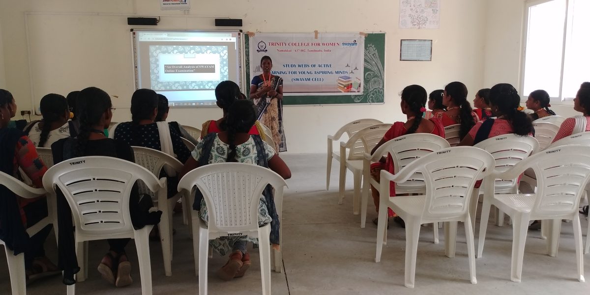 Ms. M. Rineesha, Assistant Professor and Member, Swayam, Trinity College for Women, Namakkal, delivered on the topic titled “An overall analysis of SWAYAM online examinations” on February 8, 2024. It was held in the ICT hall on the premises of the Science Block of the college. This SWAYAM-NPTEL conducts online certificate courses on a variety of subjects, for which examinations are held every semester in the mode of computer science. The swayam questions paper consists of multiple-choice questions, fill-in-the blanks and the descriptive questions. Anyone can register for these courses through the Internet. Many students of chemistry actively took part.