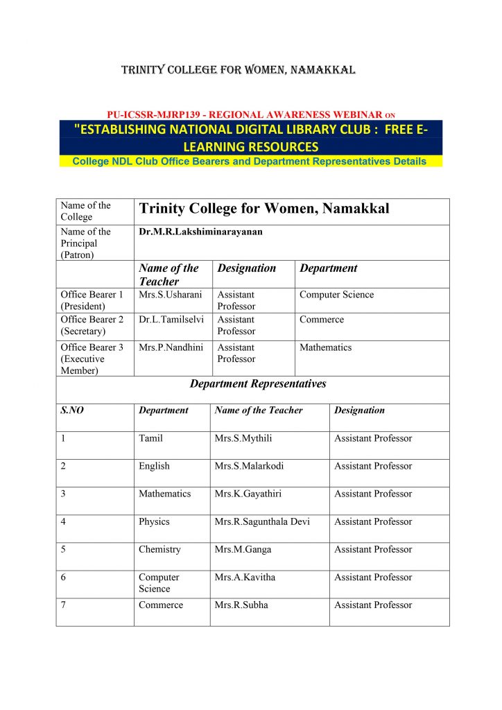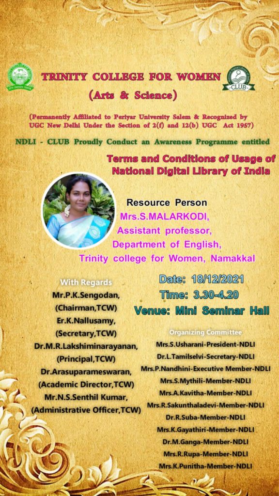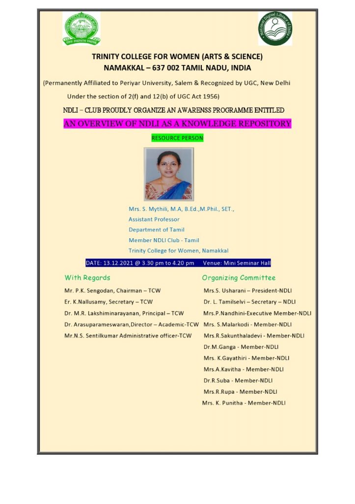 | 01 | 06.12.21 | 9.30 AM | NDLI – Club | Awareness Programme on National Digital Library of India and NDLI – Club | Mrs. S. Usharani, AP/CS &Dr L. Tamilselvi, AP/CommerceTrinity College for Women, Namakkal – 637 002 |