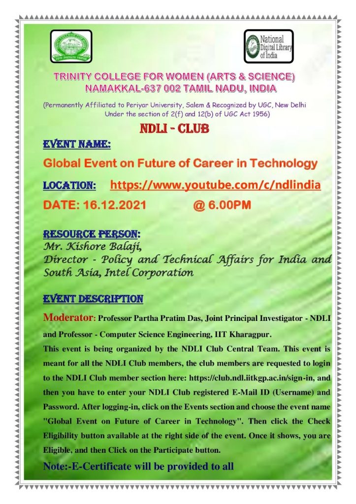 | 09 | 21.12.21 | 3.30 PM | NDLI-Club | Learning Resources Available in NDLI | Mrs. K. Punitha, AP & HOD of Costume Design and Fashion andMrs. R. Rupa, AP & HOD ofNutrition and Dietetics,Trinity College for Women,Namakkal – 637 002 |