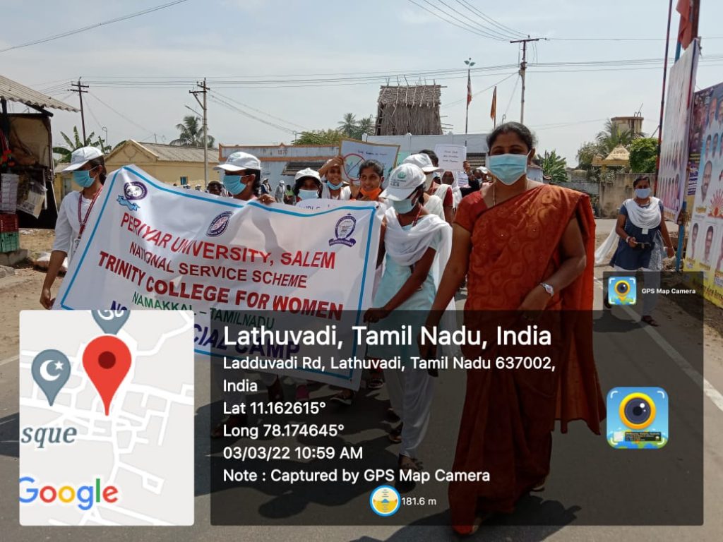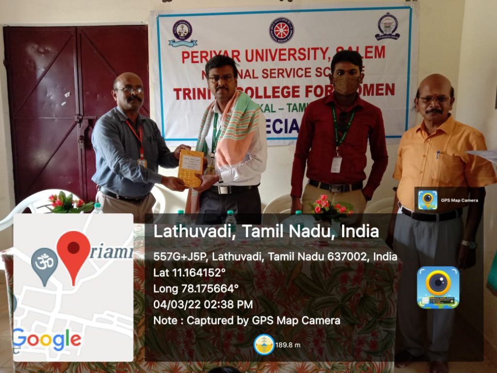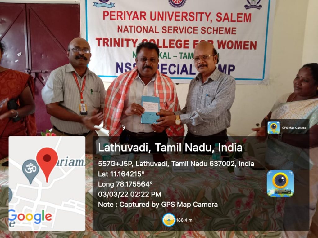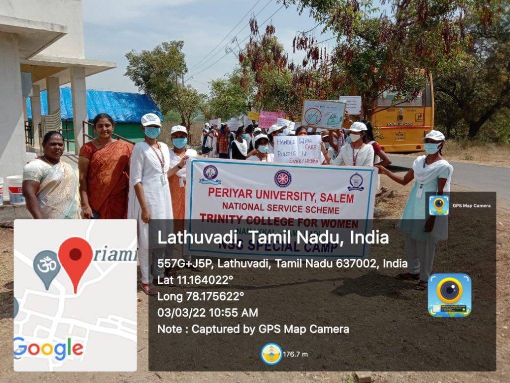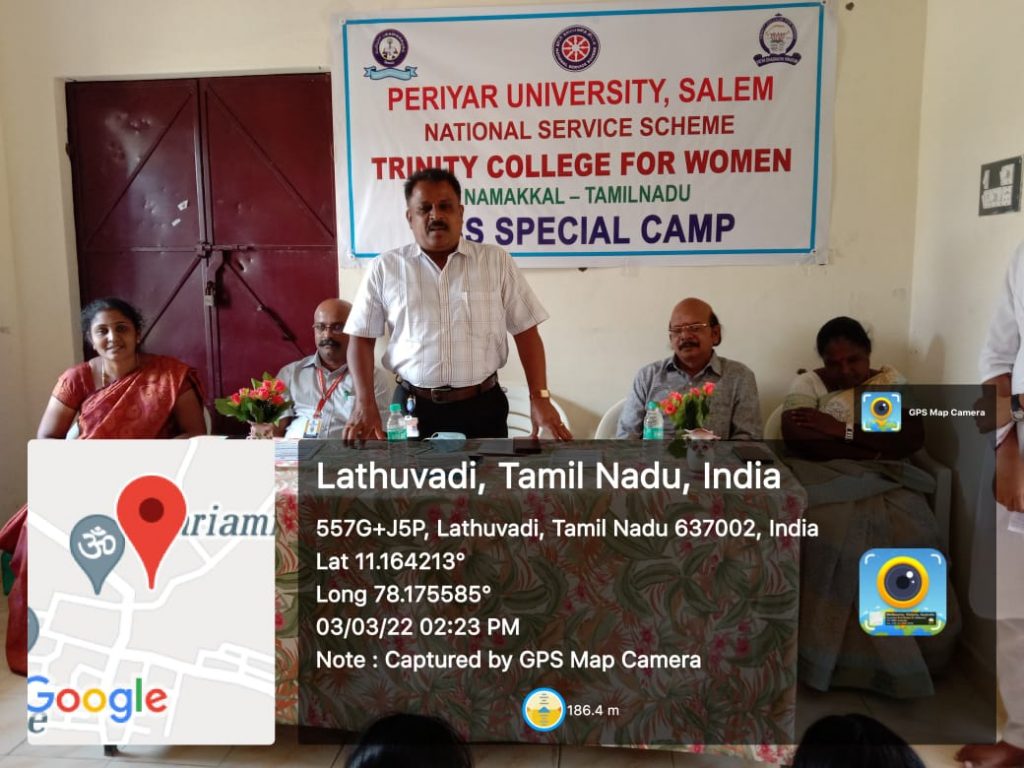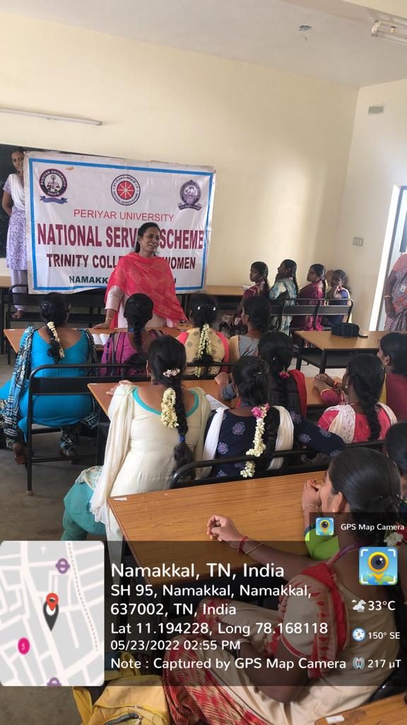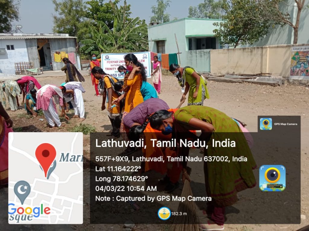In support of National Service Scheme of Periyar University, Salem, NSS camp (நாட்டுநலப்பணித்திட்ட சிறப்பு முகாம்) of Trinity College for Women, Namakkal was held from 02nd March 2022 to 08th March 2022 in the villages of Ladduvadi and Nallayagoundampudur, Mohanur Block, Namakkal district.