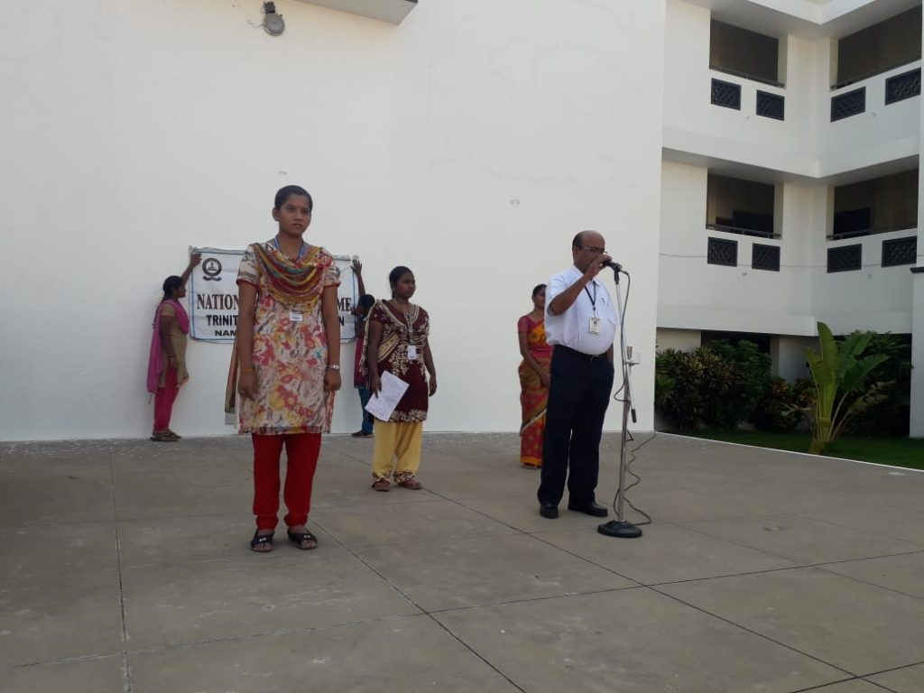 The National Service Scheme was launched on 24th September 1969. This year (2019) is the Golden Jubilee Year of NSS. The NSS units of Trinity College for Women, Namakkal celebrated Golden Jubilee Anniversary on 24.9.19 at the premises of Trinity College. Dr. M.R. Lakshiminarayanan, Principal presided over the programme. He said that students should also take part in many social activities along with University syllabi for the growth of society and nation. Dr. Arasuparameswaran, Director – Dean highlighted the importance of NSS works. The NSS Programme Officers Dr. M. Sasikala and Mrs. S. Jayamathi shared their experience on being part of the NSS Unit. All the NSS volunteers of our College participated and took the NSS oath in that NSS Golden Jubilee Celebrations.