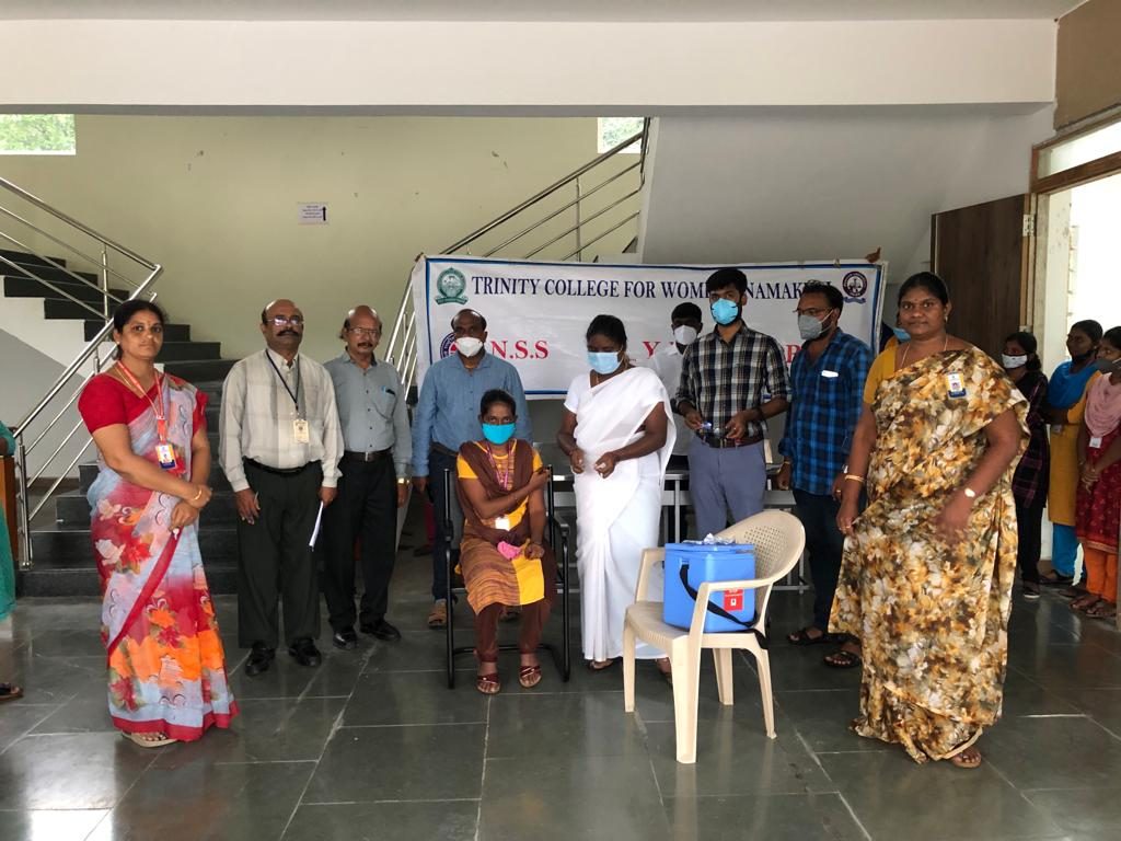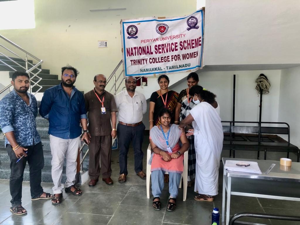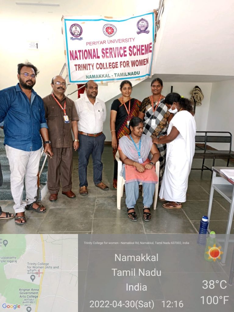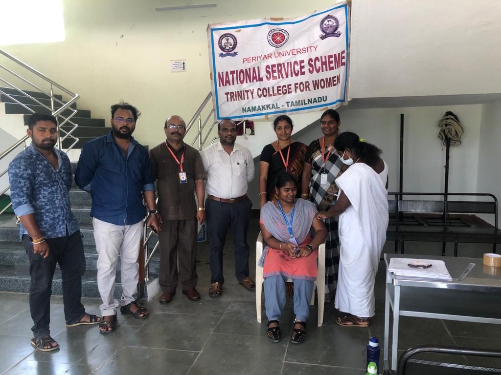 The National Service Scheme of Trinity College for Women, Namakkal, in association with the Primary Health Centre, Ernapuram, Namakkal District organized COVID 19 vaccination camp on 15th June 2022 in the College science block. Vaccination (Both Covishield and Covaxin) was done by the staff members of Primary Health Centre, Ernapuram. More than 100 students benefitted.
