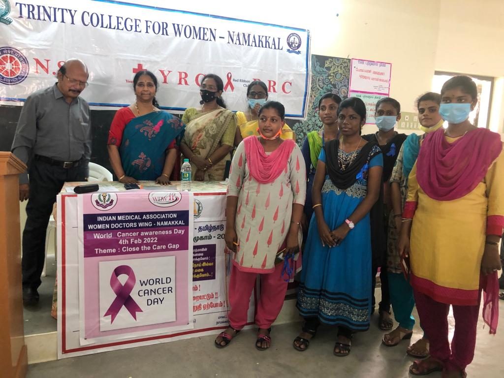 On account of observation of World Cancer Day (4th January), The National Service Scheme, Youth Red Cross, Red Ribbon Club and Trinity Women’s Forum in association with Namakkal Indian Medical Association organized an offline event in the heading of “Cancer and Leprosy Eradication Awareness Programme on 04th February 2022 (Friday) in the College mini seminar hall.