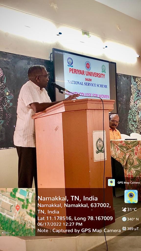 NSS Career Guidance and Orientation programme was held on 23rd May 2022 in the College mini seminar hall. Dr. T. Savithri, Post Graduate Assistant in Tamil, Government Higher Secondary School, Muthur, Kangayam Taluk, Tiruppur District spoke on the topic of “Employment opportunities in Government Sectors’ ‘