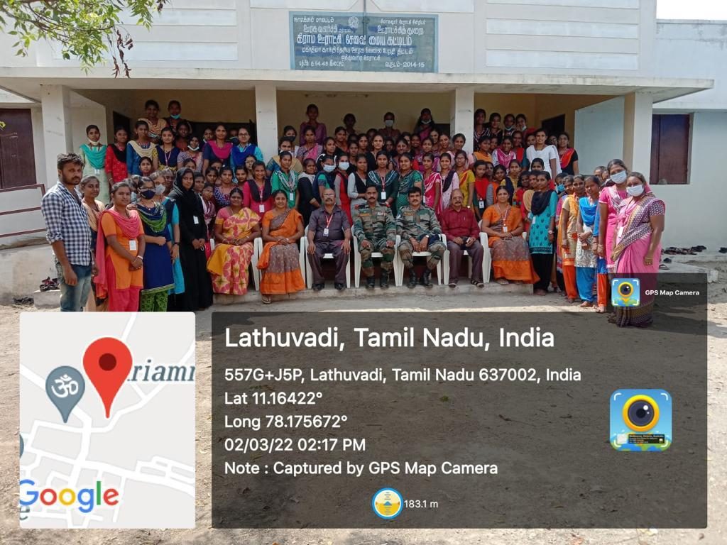 | 08.03.2022(Tuesday) | Prize distribution for school students of Panchayat Union Middle School, Ladduvadi(கலைநிகழ்ச்சிகள் விளையாட்டுப்போட்டிகள்)பள்ளிக்குழந்தைகளுக்கு பரிசுகள் வழங்குதல் மற்றும்முகாம் நிறைவு நாள்& Valedictory FunctionDr. P. Prakash, Coordinator,National Service Scheme,Periyar University, Periyar Palkalai Nagar, Salem was the special invitee. He gave away prizes and certificates to all the participants of cultural programme and sports events. | Mrs. R. Thenmozhi,Block Development Officer,Mohanur Block,Namakkal District gave lectured in the topic of “Women Empowerment”தலைப்பு பெண்கள் மேம்பாட்டு திட்டம் பற்றிய சிறப்புரை திருமதி ஆர் தேன்மொழி வட்டார வளர்ச்சி அலுவலர் , மோகனூர் |
