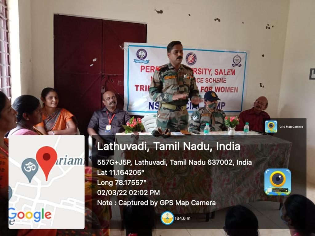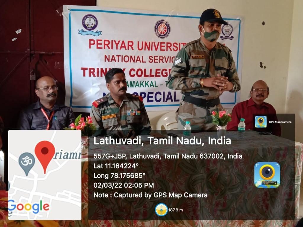| 02.03.2022(Wednesday) | Inauguration of NSS Camp – Cleaning worksதூய்மைப் பணிகள்Under the supervision of Management, Principal, Director – Academic, NSS Programme Officers and Administrative Officer.முகாம் துவக்க விழா – கல்லூரி நிர்வாகத்தினர், முதல்வர், உயர்கல்வி இயக்குனர், – நிர்வாக அலுவலர், & நாட்டு நலப்பணித் திட்ட அலுவலர்கள் – | Special talk in the title of “Enrichment of self confidence, personal and leadership skills”Name of the Resource Persons:-Subedar Mr. M. Manoharan &Havildar Mr. N.S. Jose,12 (Tamil Nadu) Battalion, National Cadet Corps, Salem Division. Salem – 636 016. |