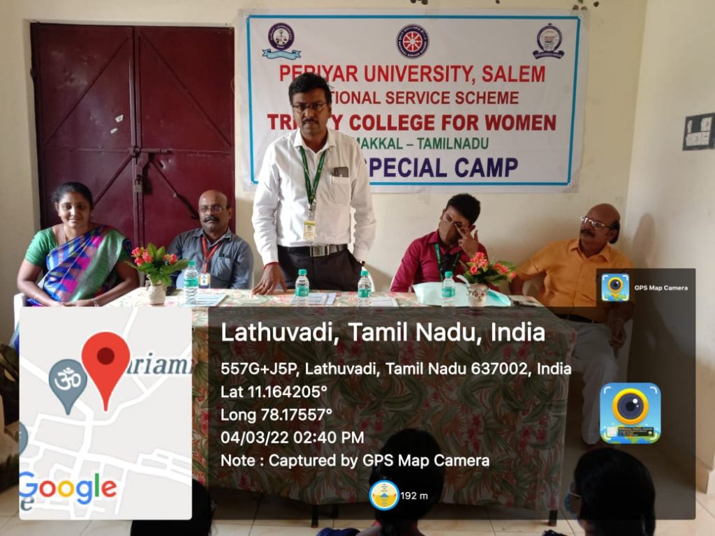 Dr. P. Paul Princy, P.A. to District Collector, Namakkal, Mr. V. Sathyamurthy, President, Mr. M. Thillai Sivakumar, Secretary, Mr. N. Sivaprakasam, Treasurer, Green (Pasumai) Namakkal, Dr. R. Kulandaivel, Chief Medical Officer and Dr Malliga Kulandaivel, Gynecologist, Thangam Hospital & Cancer Centre, Namakkal, Mrs. G. Gnanarathinam, Yoga Trainer, Sivanandha Yoga Research Centre, Madurai, Ms. T. Savithiri, Member of Tamil Nadu State Board Syllabus Technical Committee, Chennai, Mr. T. John Bosco, Village Administrative Officer, Mrs. R. Parameswari Rajini, President, Mr. Selvaraj, Secretary of Lathuvadi village, Mrs. Vimala, English Teacher, Panchayat Union (Mohanur) Middle School, Lathuvadi, Mr. Balachandran, Branch Manager and Mr. Daniel, staff of HDFC Bank, Namakkal Branch, Mr. Sivakumar, Senior Manager, HDFC Bank, Salem, Mr. P. Sridhar and Mr M. Mohan, Members of Nehru Yuvakendra, Namakkal were the special invitees. Beside that Dr T.K. Anuradha, HOD of Tamil, Dr. G. Selvalakshmi, HOD of Commerce, Mrs. R. Navamani, AP/CS and Dr. R. Savithiri, AP/Tamil spoke the various topics in that NSS camp.
