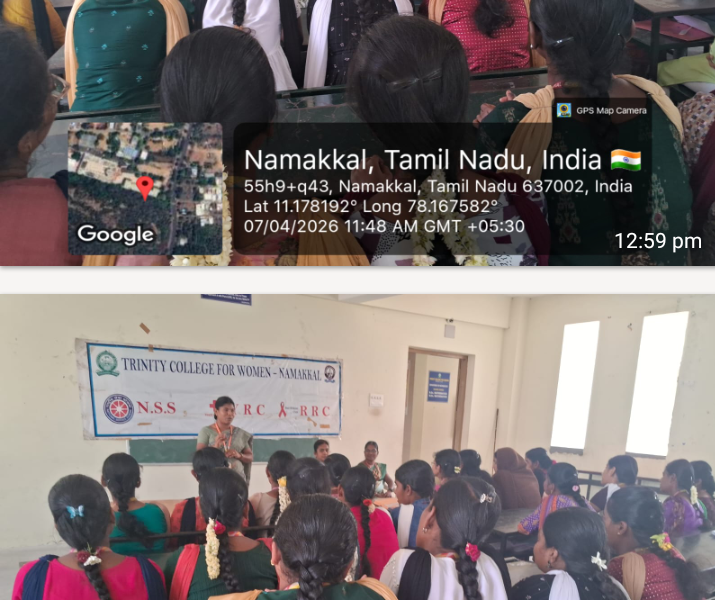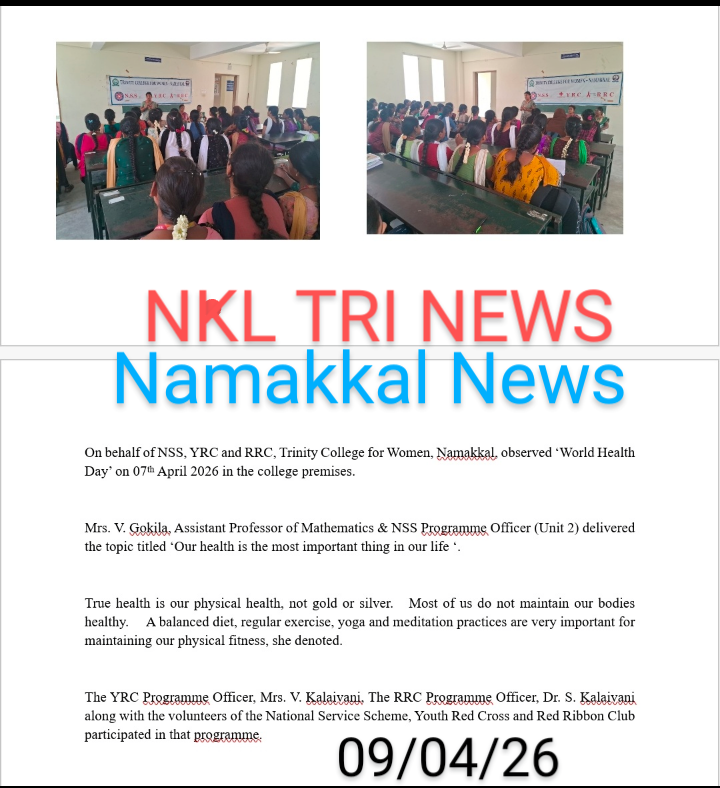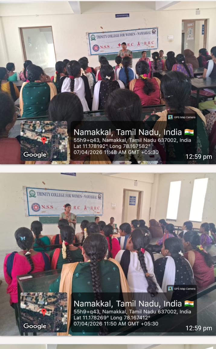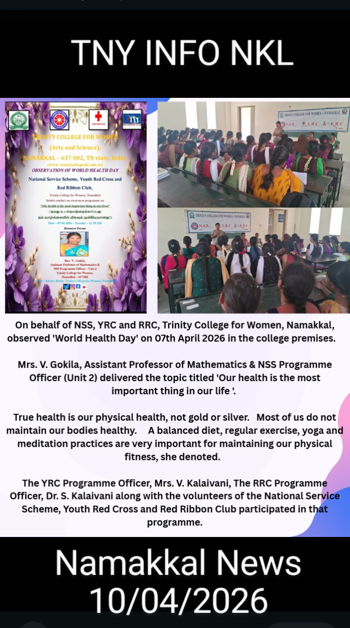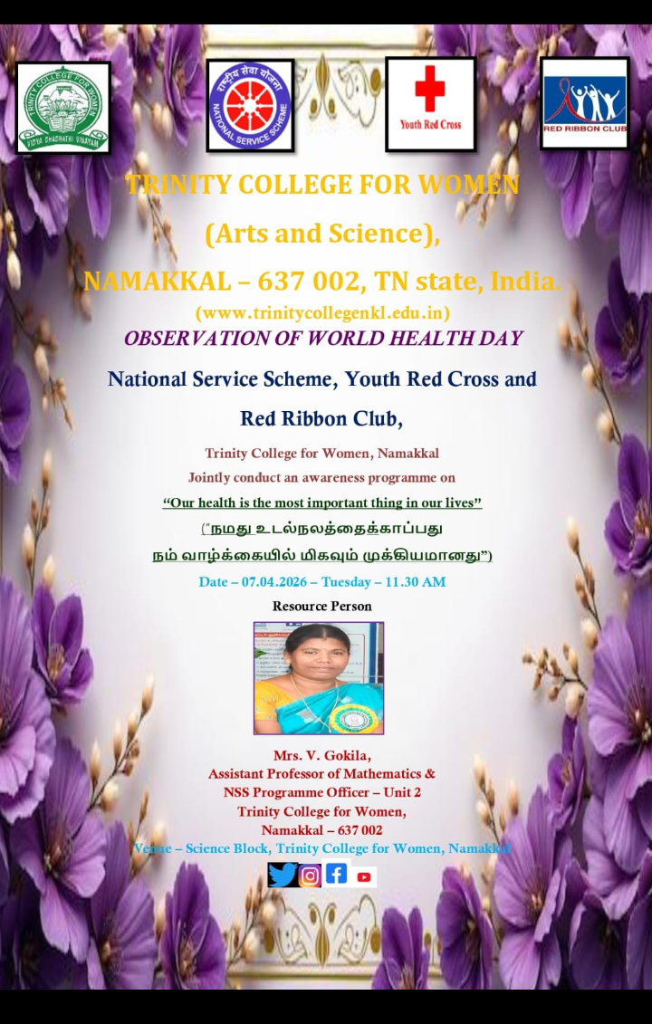 On account of the observance of World Health Day, the National Service Scheme, Youth Red Cross, and Red Ribbon Club of Trinity College for Women, Namakkal jointly organized an awareness programme titled “Our health is the most important thing in our life” (நமது உடல்நலத்தைக் காப்பது…..நம் வாழ்க்கையில் மிகவும் முக்கியமானது ) on April 7th, 2026, in the science block of the College. Mrs. V. Gokila, Assistant Professor of Mathematics and Programme Officer of the National Service Scheme, Trinity College for Women, Namakkal, was the resource person.