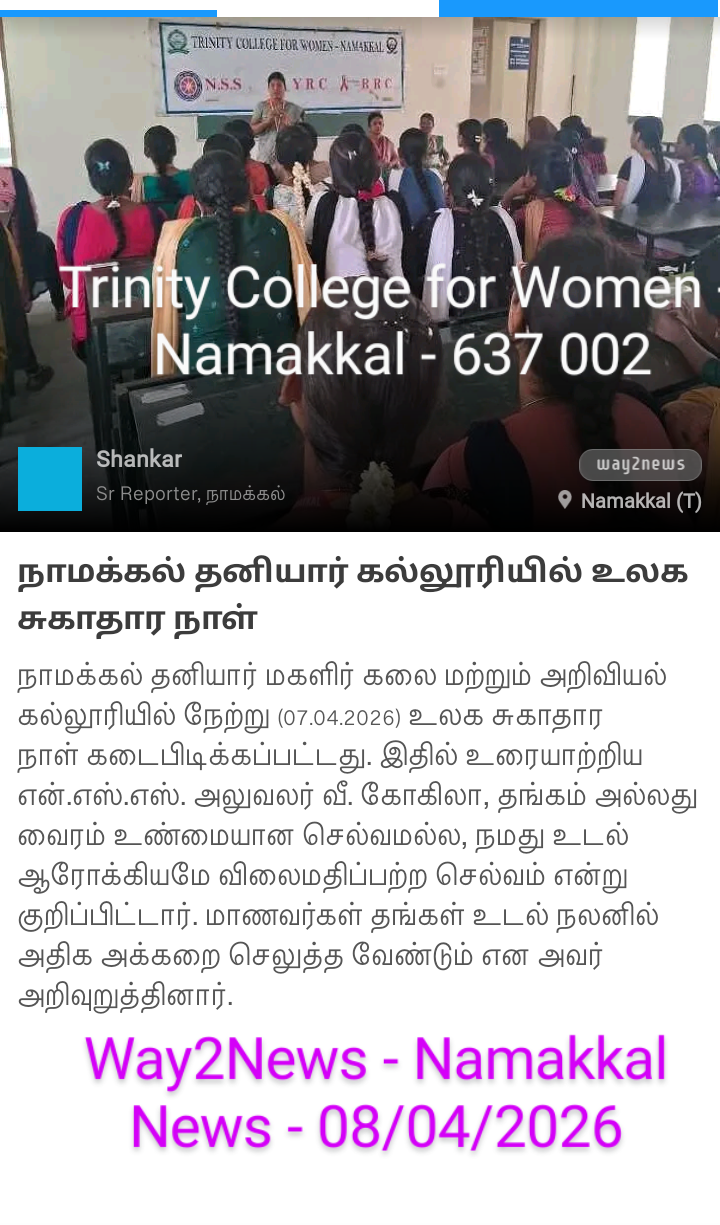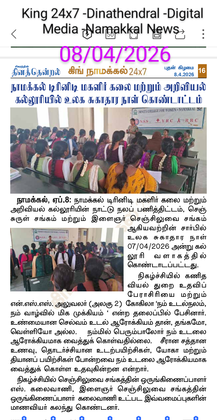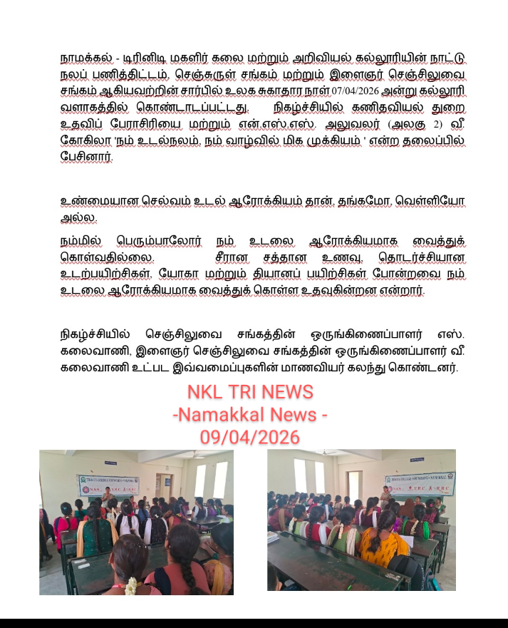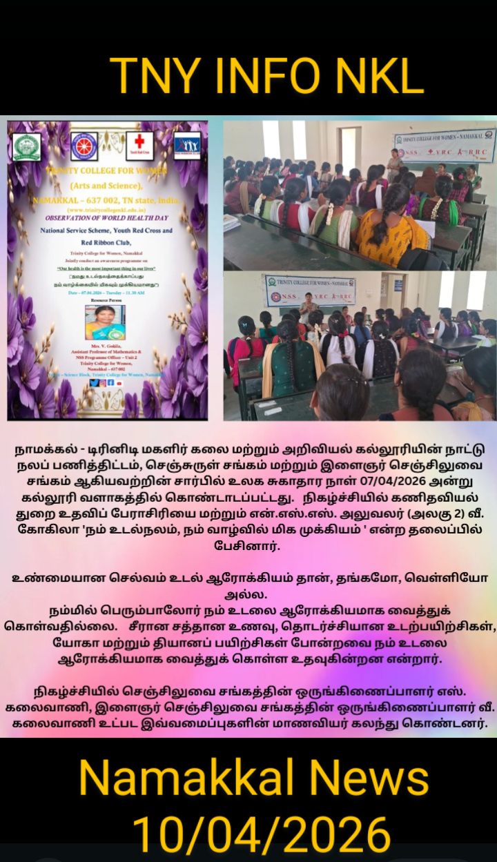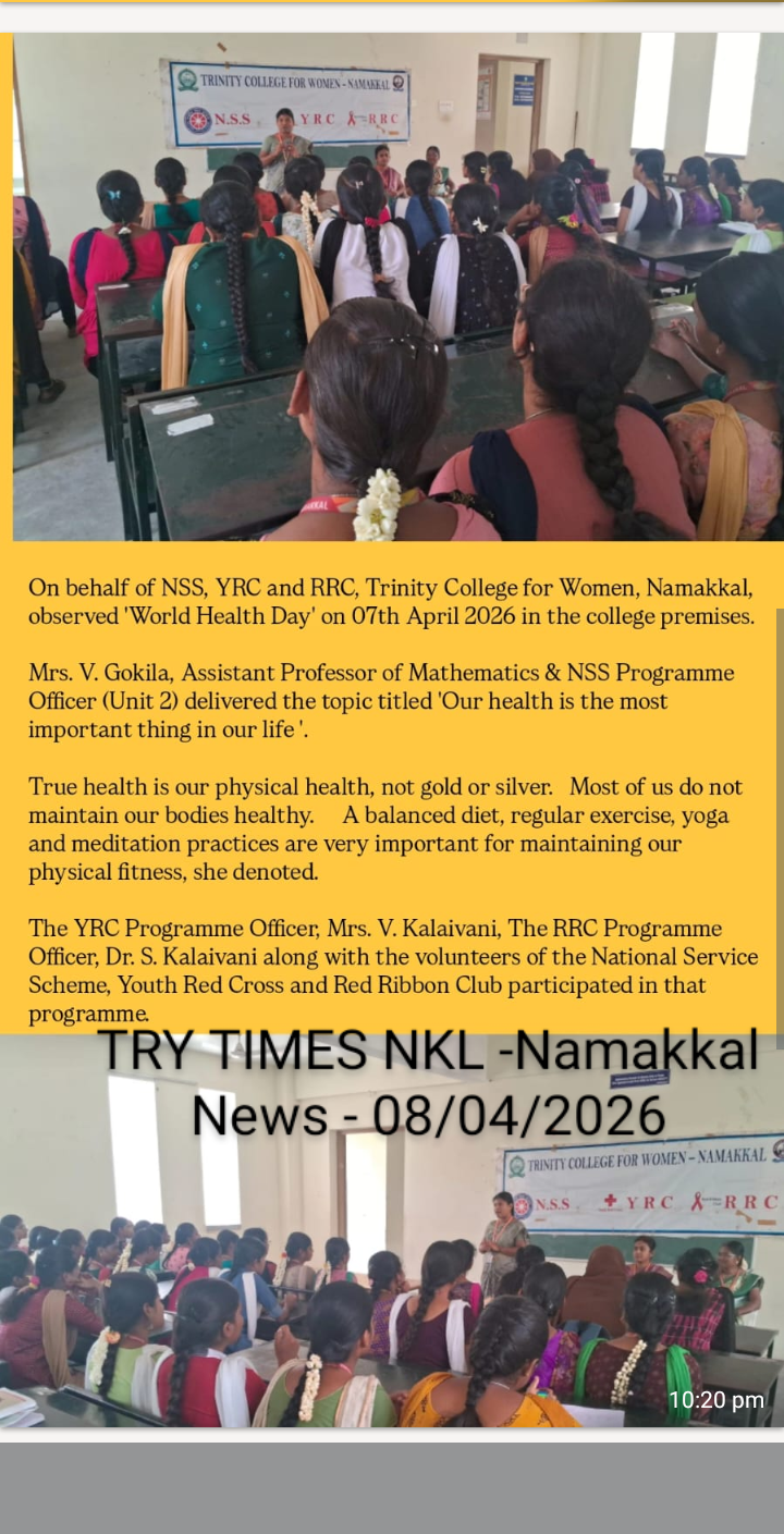 On account of the observance of World Health Day, the National Service Scheme, Youth Red Cross, and Red Ribbon Club of Trinity College for Women, Namakkal jointly organized an awareness programme titled “Our health is the most important thing in our life” (நமது உடல்நலத்தைக் காப்பது…..நம் வாழ்க்கையில் மிகவும் முக்கியமானது ) on April 7th, 2026, in the science block of the College. Mrs. V. Gokila, Assistant Professor of Mathematics and Programme Officer of the National Service Scheme, Trinity College for Women, Namakkal, was the resource person.