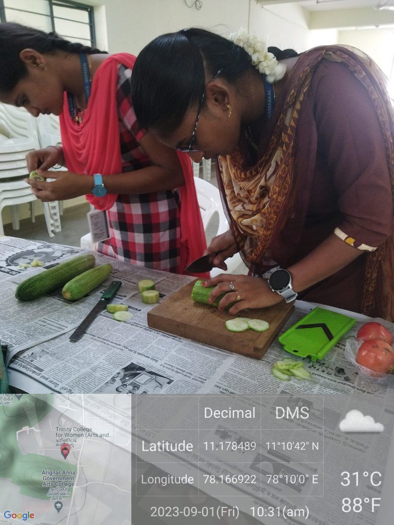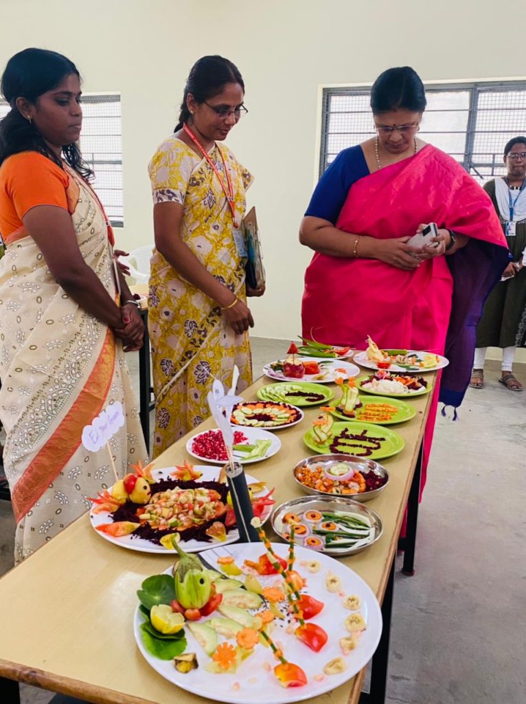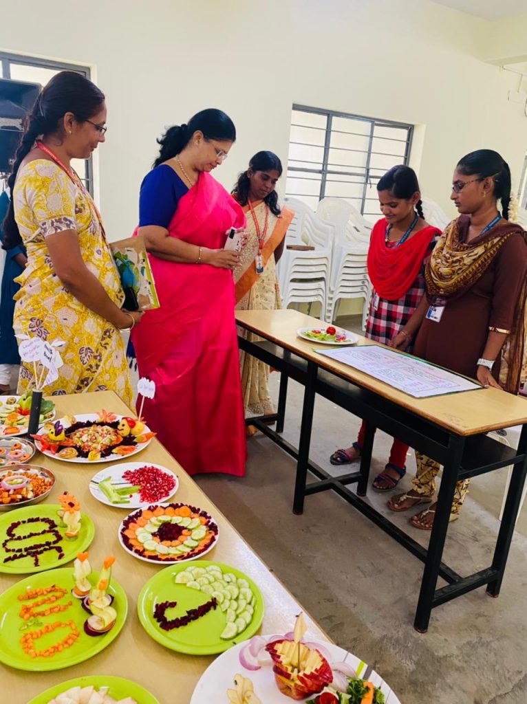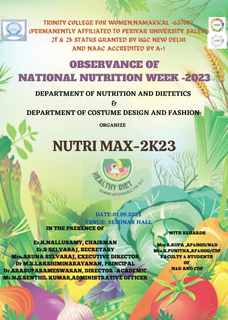 In consequence of the celebration of National Nutrition Week 2023, the departments of Nutrition and Dietetics and Costume Design and Fashion, Trinity College for Women, Namakkal, conducted a programme entitled “NUTRI MAX 2K23” on September 1, 2023. The competitions for salad decoration with fruits and vegetables and placard making (malnutrition) were held on the college campus. The following students have obtained the first three positions:
