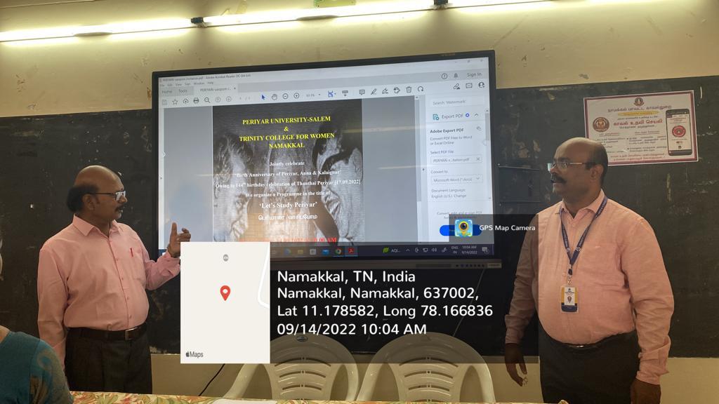 On account of 144th birth anniversary (17th September) of Thanthai Periyar, Periyar University, Salem and Trinity College for Women, Namakkal jointly organized a programme in the title of “Periyarai Vaasippom” – பெரியாரை வாசிப்போம்” (Let’s study Periyar) on 14th September 2022.