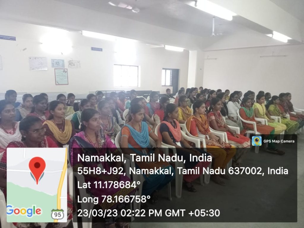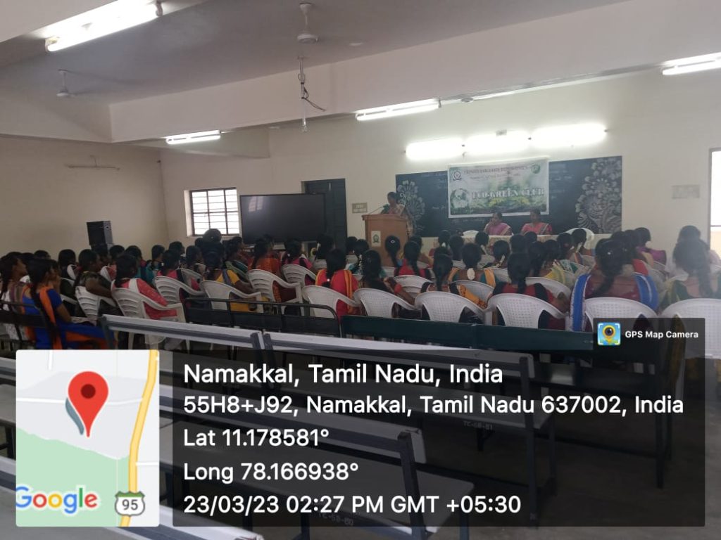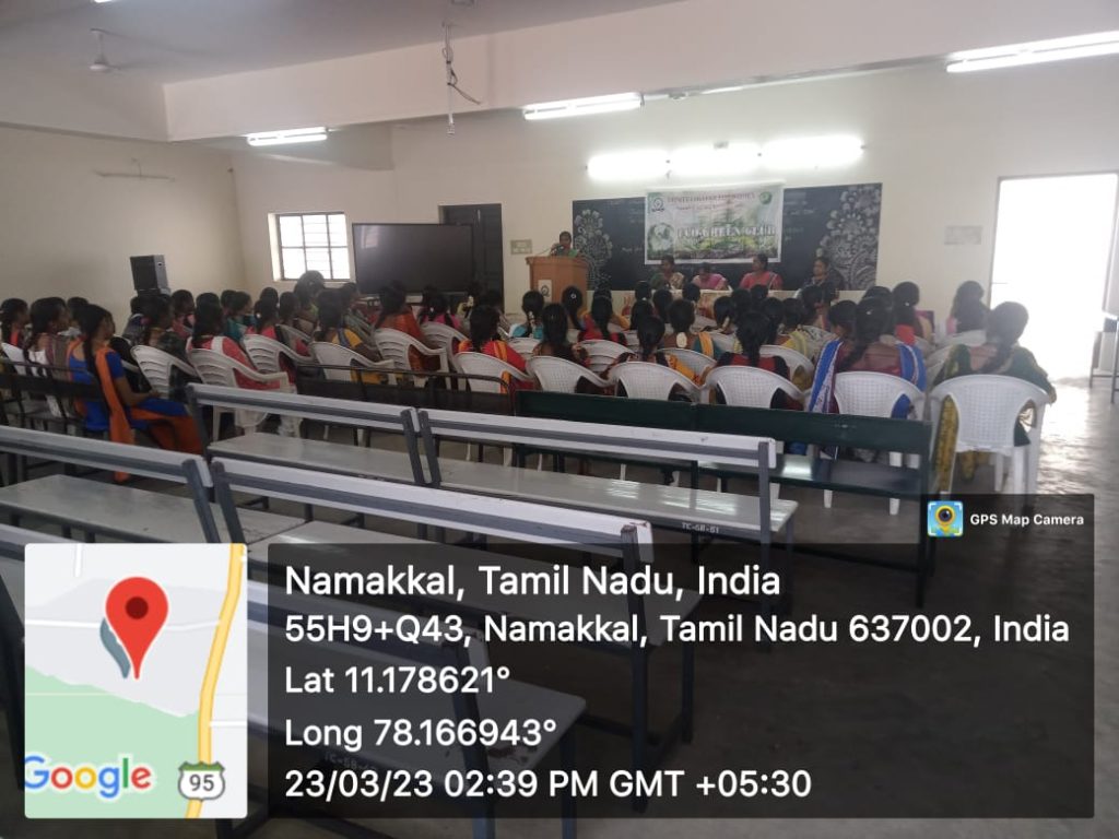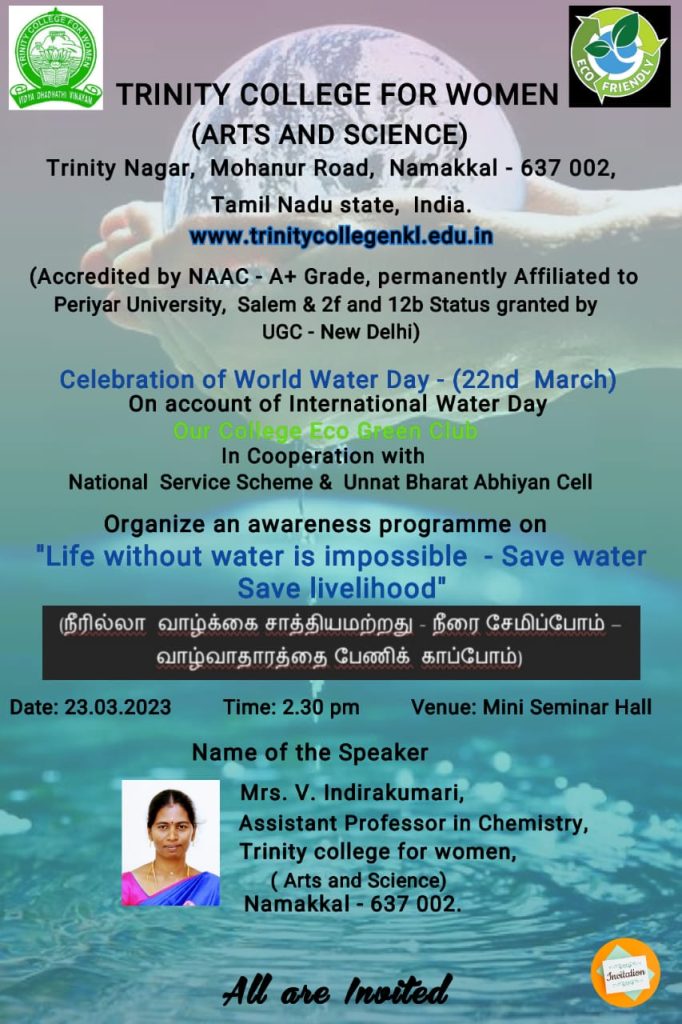 On account of celebration of International Water Day (22nd March), Eco Green Club in association with National Service Scheme and Unnat Bharat Abhiyan Cell of Trinity College for Women, Namakkal organized an awareness programme entitled “Life without water is impossible – save water & save livelihood” (நீரில்லா வாழ்க்கை சாத்தியமற்றது – நீரை சேமிப்போம் – வாழ்வாதாரத்தை பேணிக் காப்போம்) on 23.03.2023 in the College campus. Mrs. V. Indirakumari, Assistant Professor in Chemistry, Trinity College for Women, Namakkal was the resource person. She explained to the students the significance of water conservation, its urgent need and how every individual could contribute towards it. This program helped out at creating awareness among the students about the necessity for water conservation to contribute a sustainable living for the future generations as our earth’s natural resources are depleting at an alarming rate.