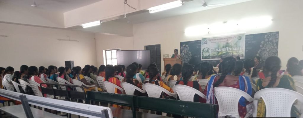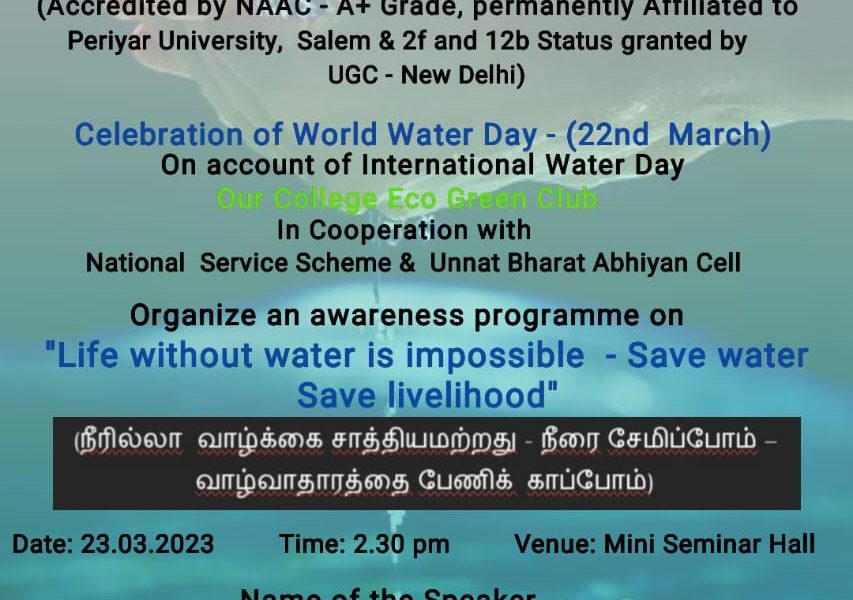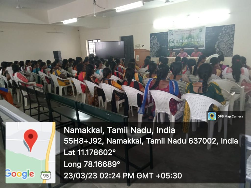 On account of celebration of International Water Day (22nd March), Eco Green Club in association with National Service Scheme and Unnat Bharat Abhiyan Cell of Trinity College for Women, Namakkal organized an awareness programme entitled “Life without water is impossible – save water & save livelihood” (நீரில்லா வாழ்க்கை சாத்தியமற்றது – நீரை சேமிப்போம் – வாழ்வாதாரத்தை பேணிக் காப்போம்)