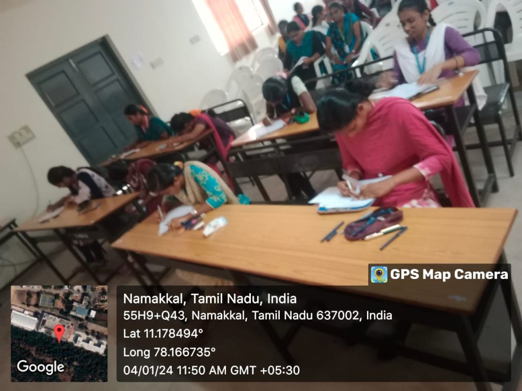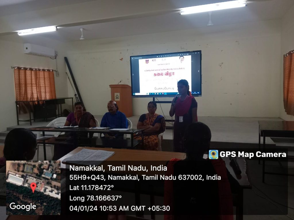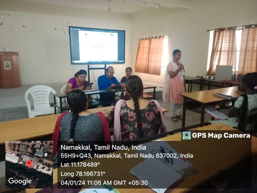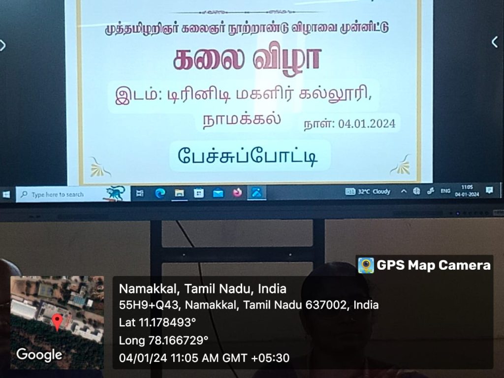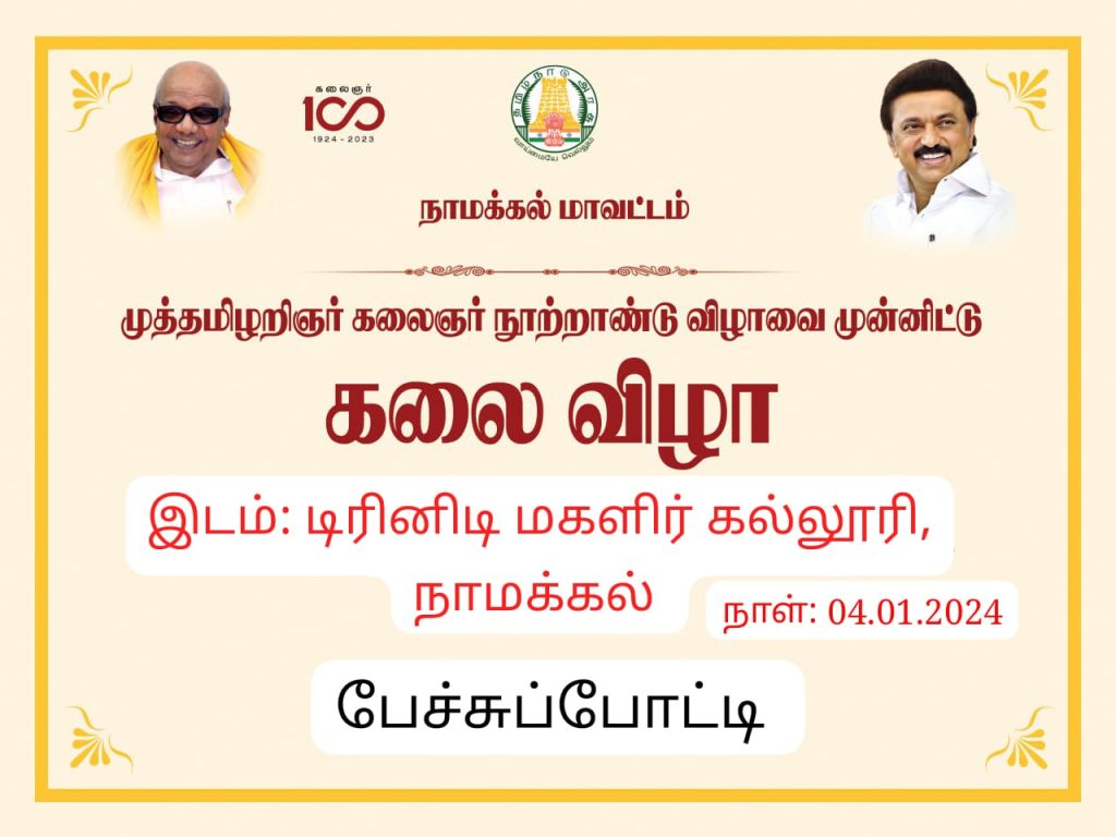 On account of former Chief Minister of Tamil Nadu, Dr. Kalaignar M. Karunanithis’s centenary celebrations, the postgraduate research department of Tamil Trinity College for Women, Namakkal, conducted a one-day competition like quiz programme,  elocution competition, and essay writing competition on January 4, 2024, on the college campus.