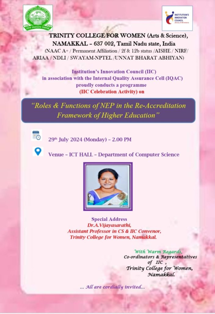 On account of implementation of New Education Policy (2020) in India, Institution’s Innovation Council, in association with the Internal Quality Assurance Cell, Trinity College for Women, Namakkal conducted a programme titled “The Role and Functions of New Education Policy in the Re-Accreditation Framework of Higher Education” on 29th July 2024.